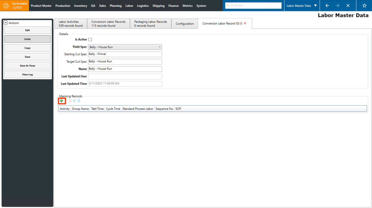 Step 5: Next, you can start adding Manning Records. Manning records are labor activities (from the labor activities tab) that are involved in competing the conversion labor record (converting meat from one cut spec to another). Click the green "+" button under the "Manning Records" title.