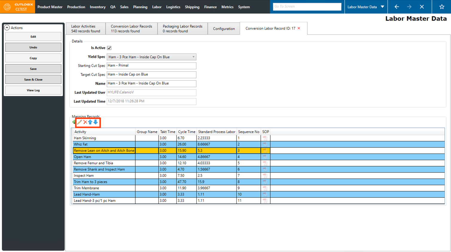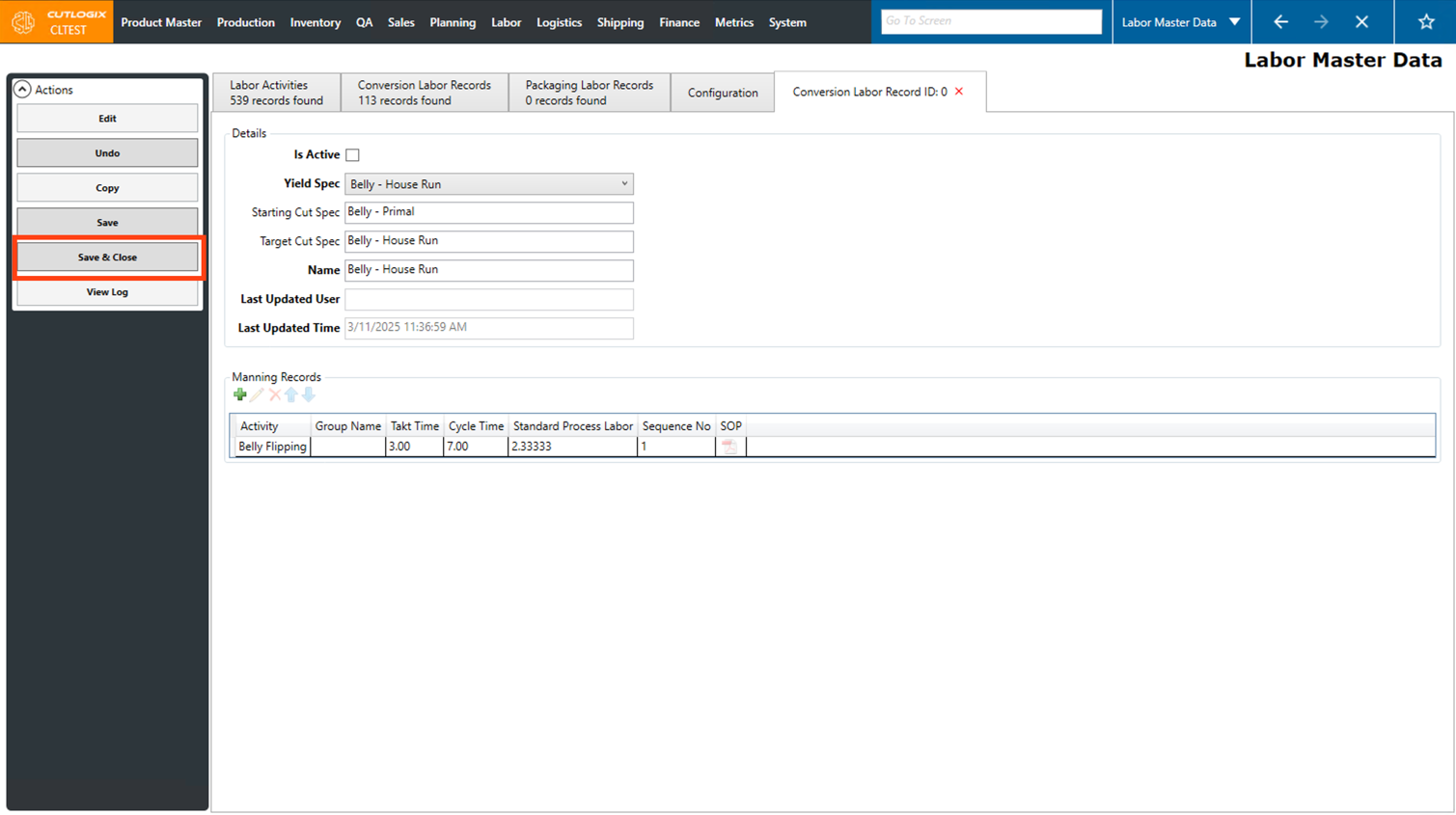 Step 6: Once you're finished making changes to the conversion labor record, click the "Save" button in the Actions Panel to save your changes. Alternatively if you want to save and close the edit tab, click the "Save and Close" button.