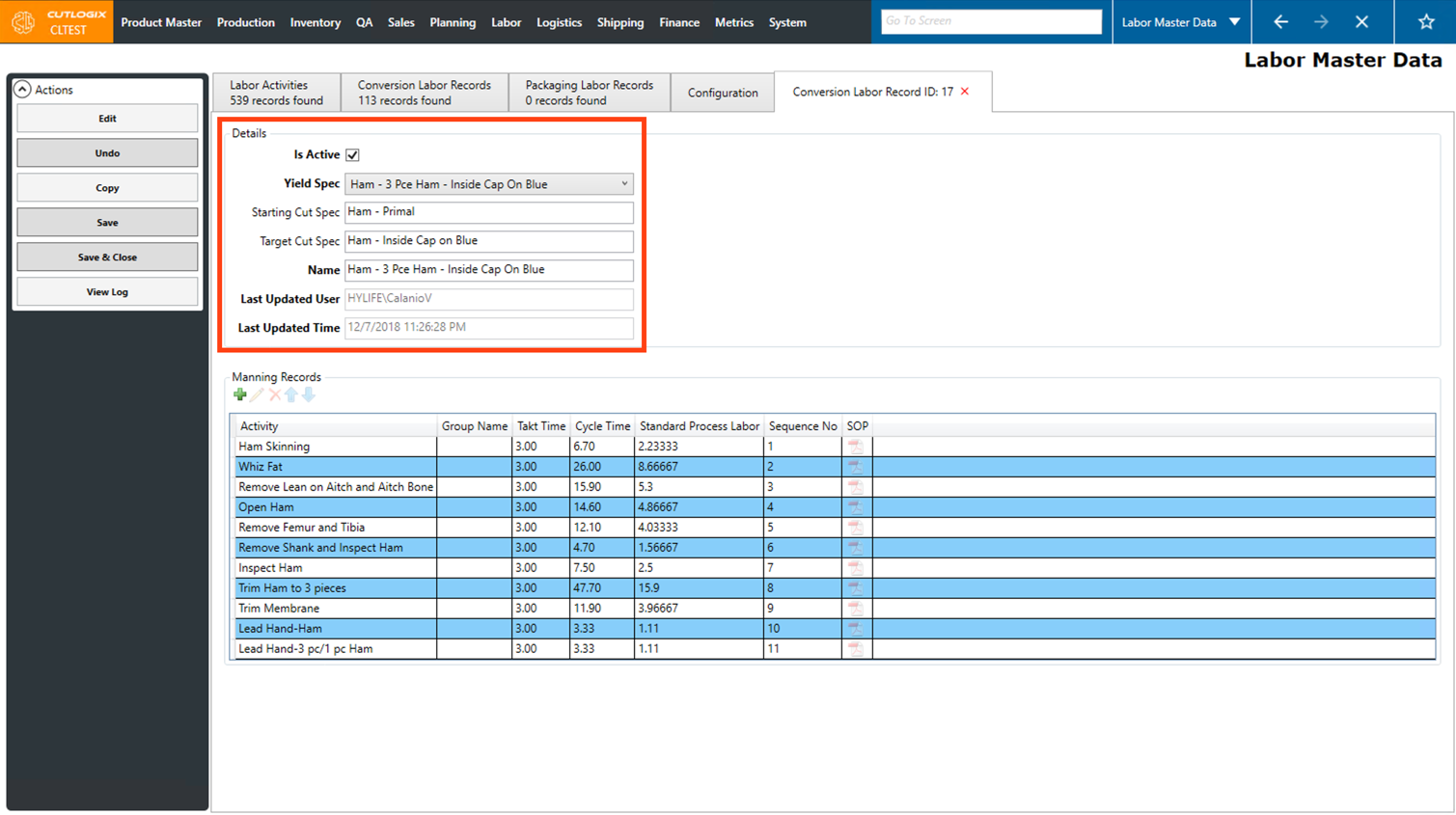 Step 4: In the "Details" section, you can then make changes to the yield spec, the name of the conversion labor record and the active status.
