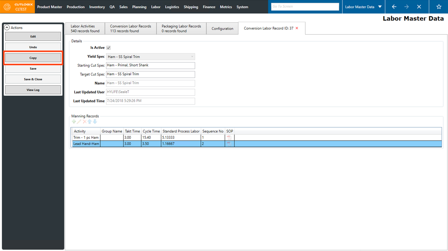 Step 4: A new tab will open on the page. This tab is a duplicate of the record that was copied. Here you can make changes to the record such as changing the yield spec, name and adding/editing manning records to make it suitable for the new conversion labor record. (Further information on how to edit can be found in the section above.)