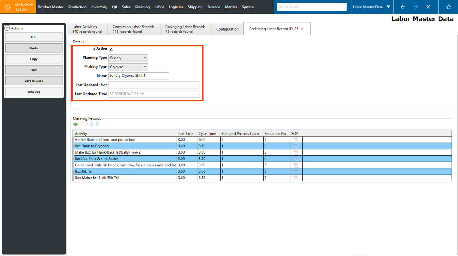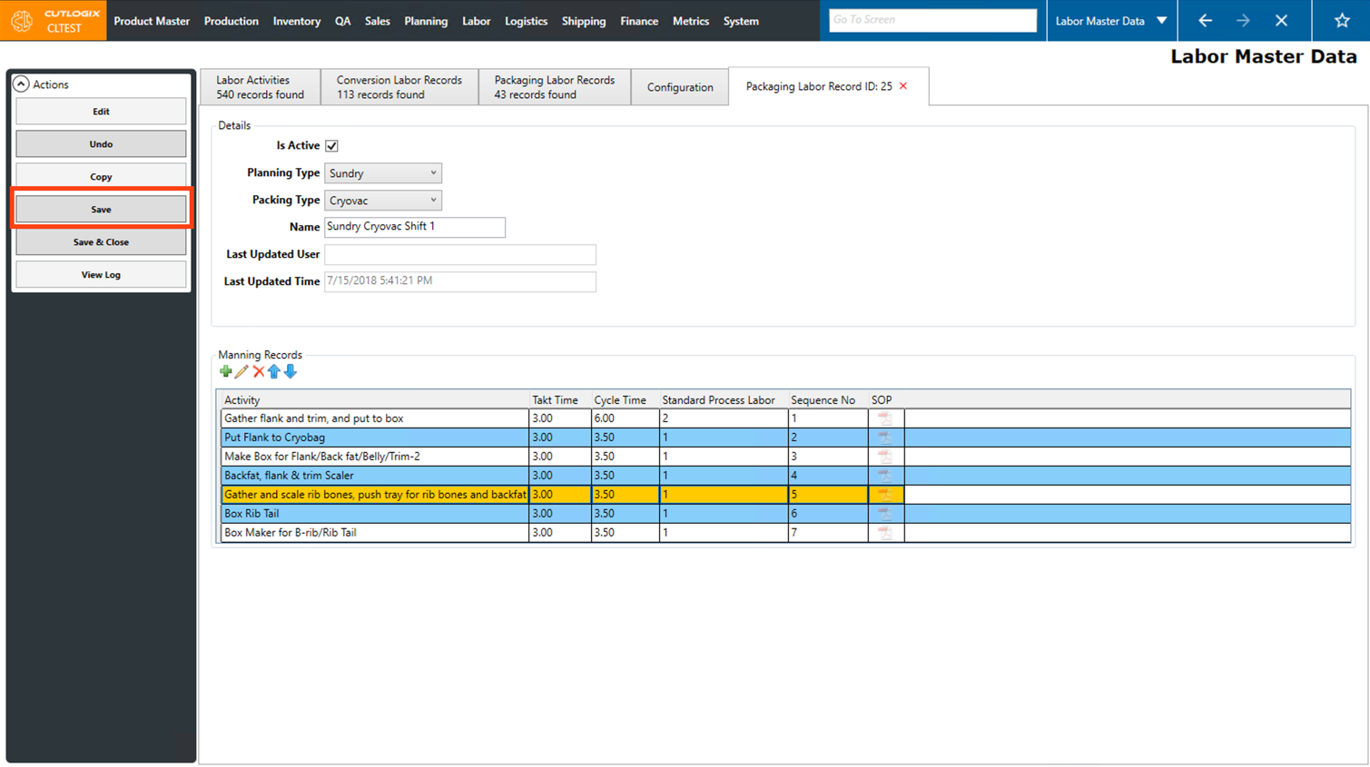 Step 5: Once all the modifications to the new packaging labor record have been completed, click the "Save" button in the Actions Panel to save the new record. Alternatively if you want to save and close the details tab, click the "Save and Close" button.