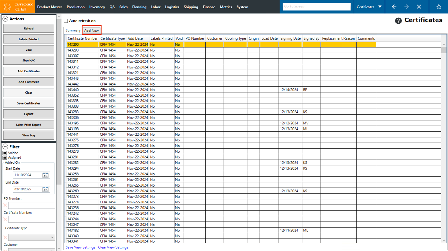 DemoStep 1: Navigate to the "Certificates" page (Under the Logistics menu → Certificates).