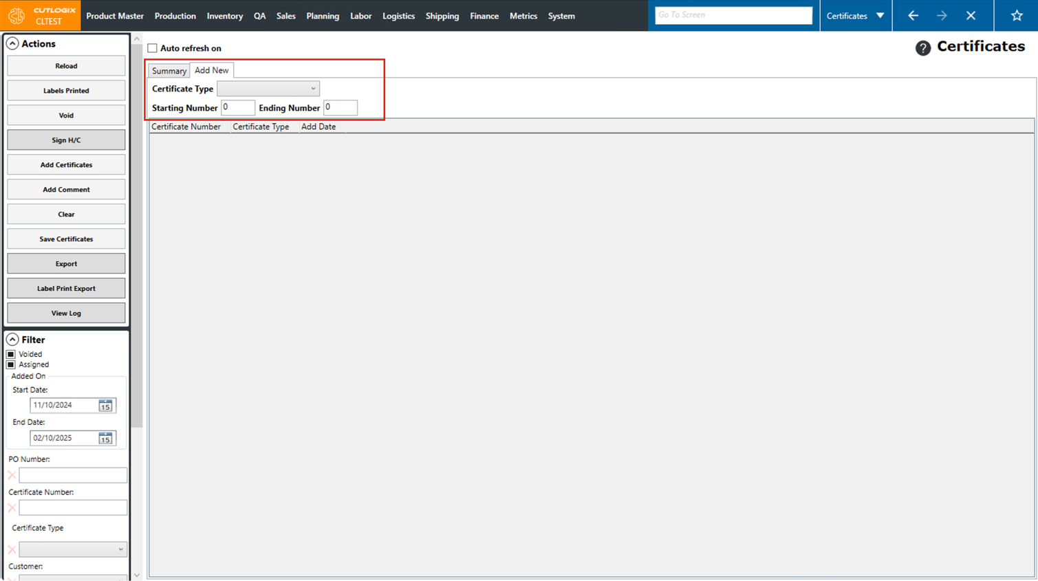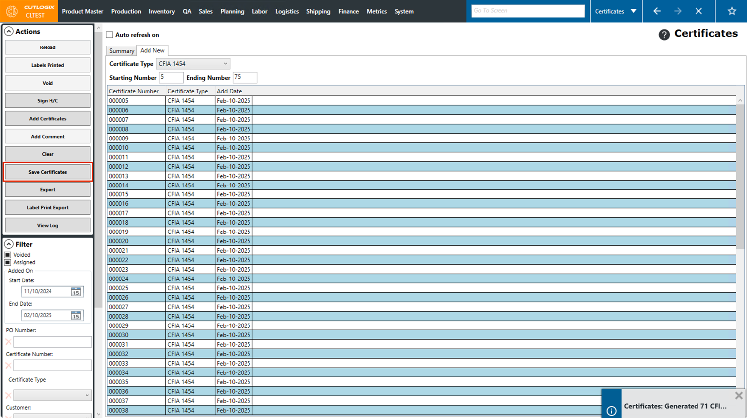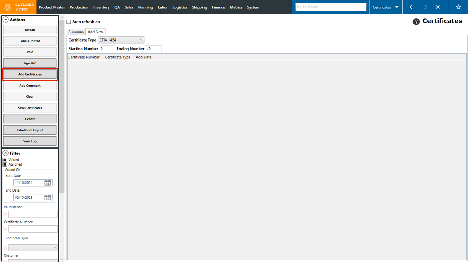 Step 4: Once the certificate type and start/end numbers have been filled out, click the "Add Certificates" button in the Actions Panel. the certificates to be added will appear on the screen.