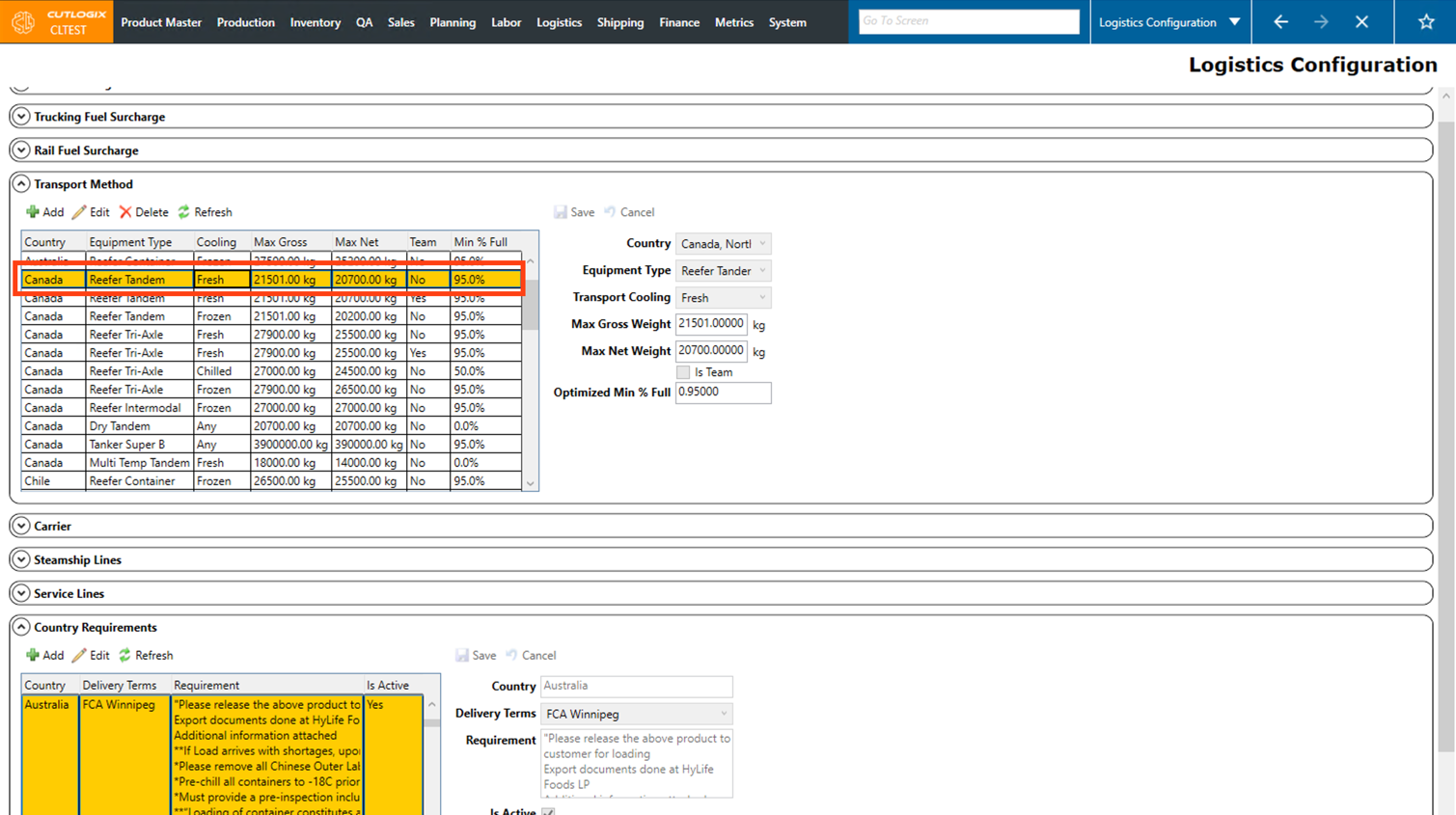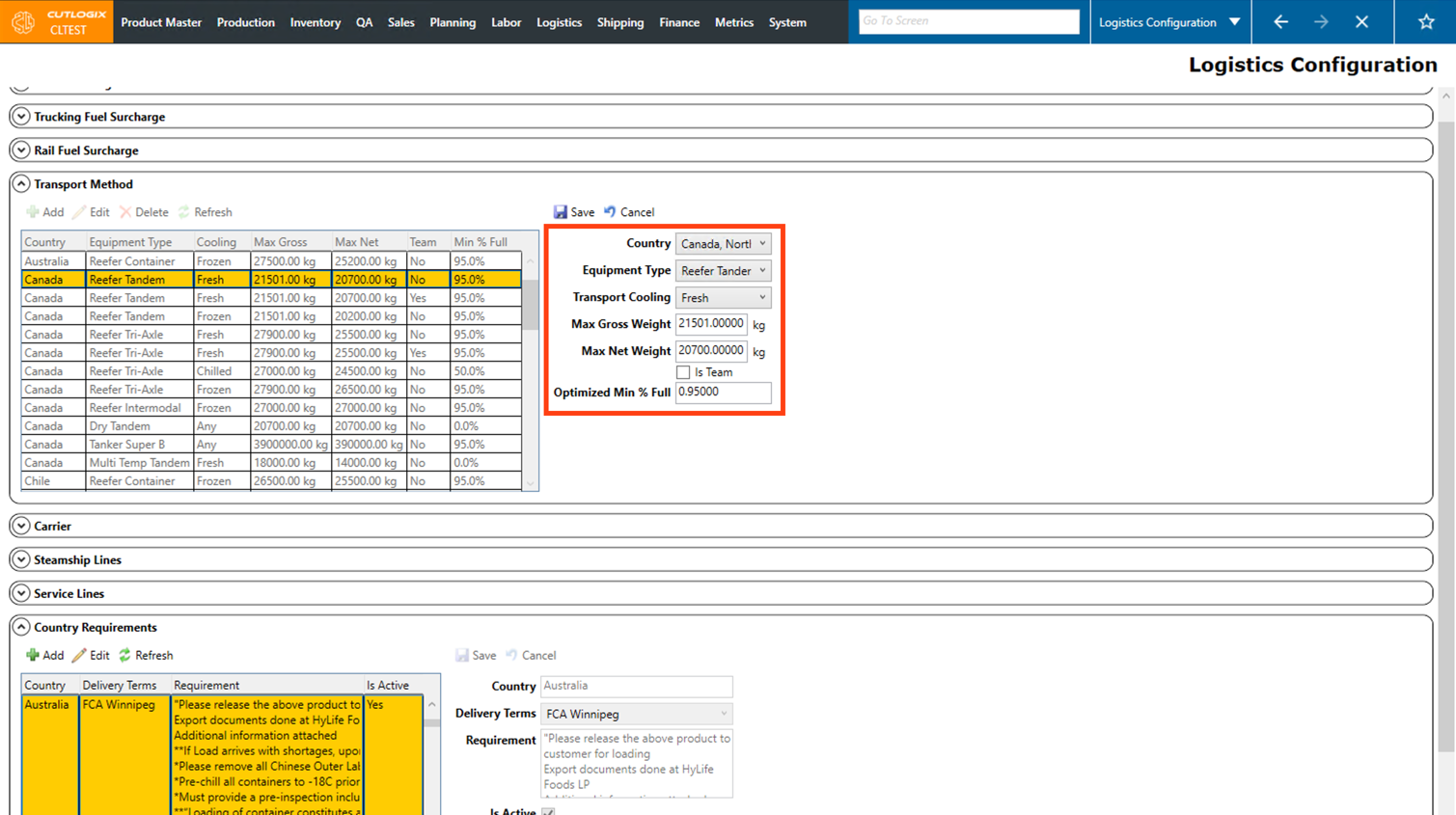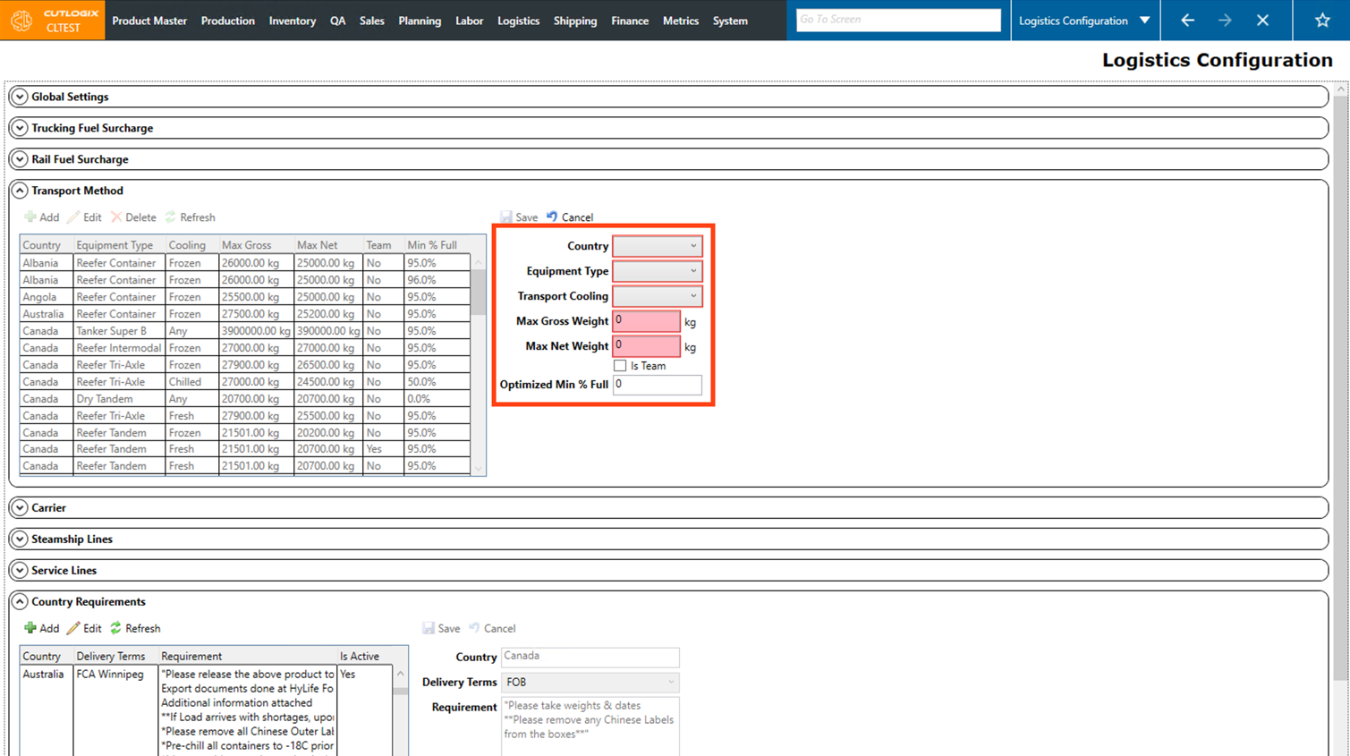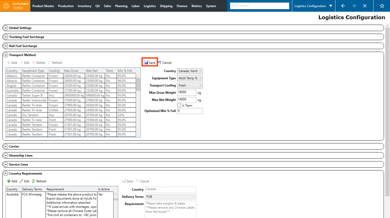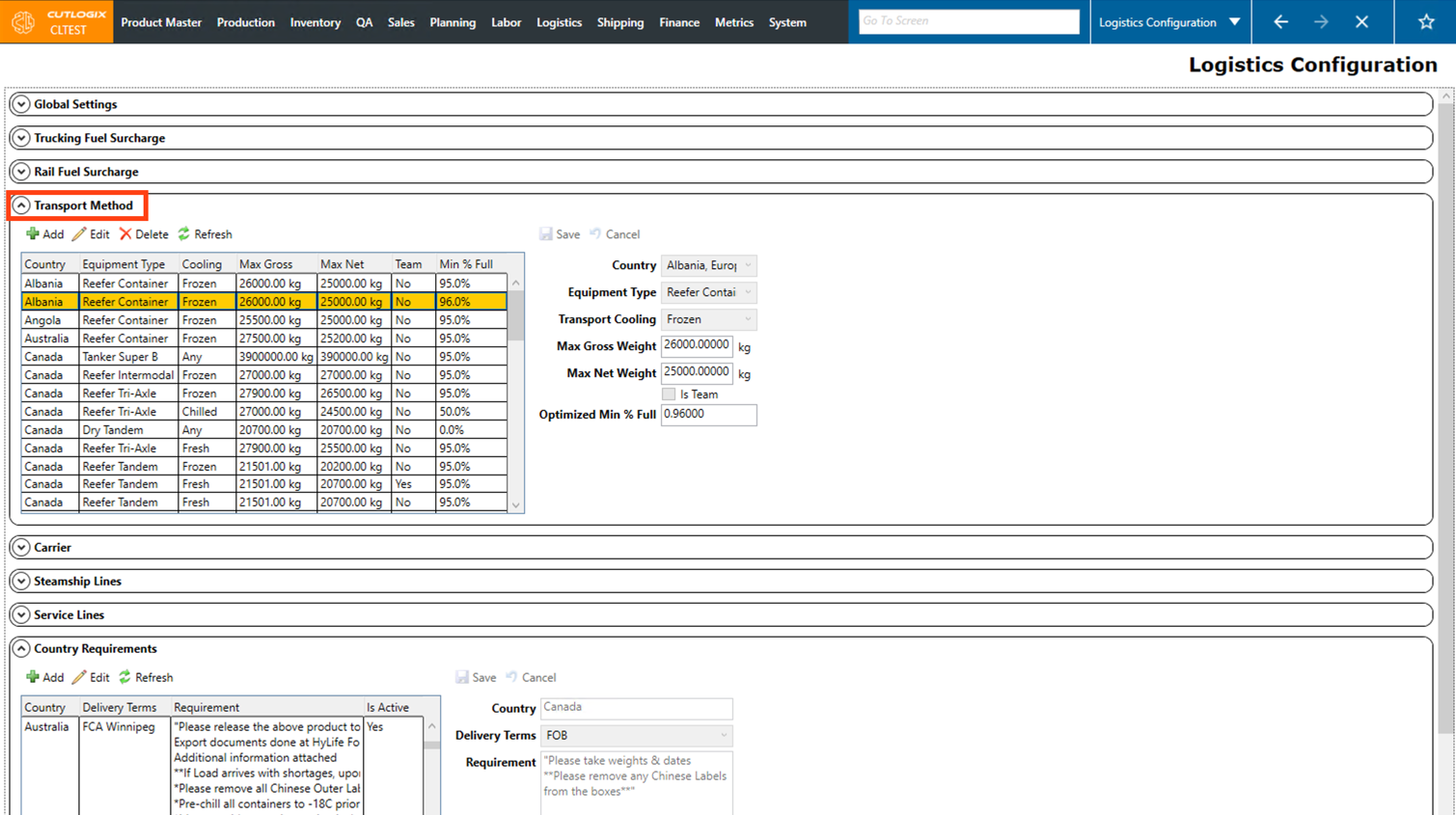 • Transport Cooling: Choose the type of cooling that this transport method is for, from the dropdown list. (Any, Fresh, Frozen, Chilled).