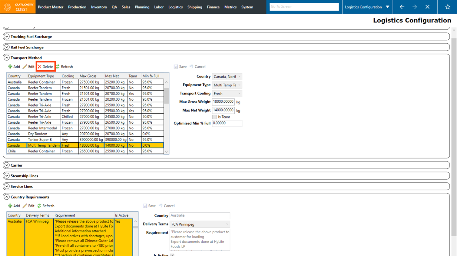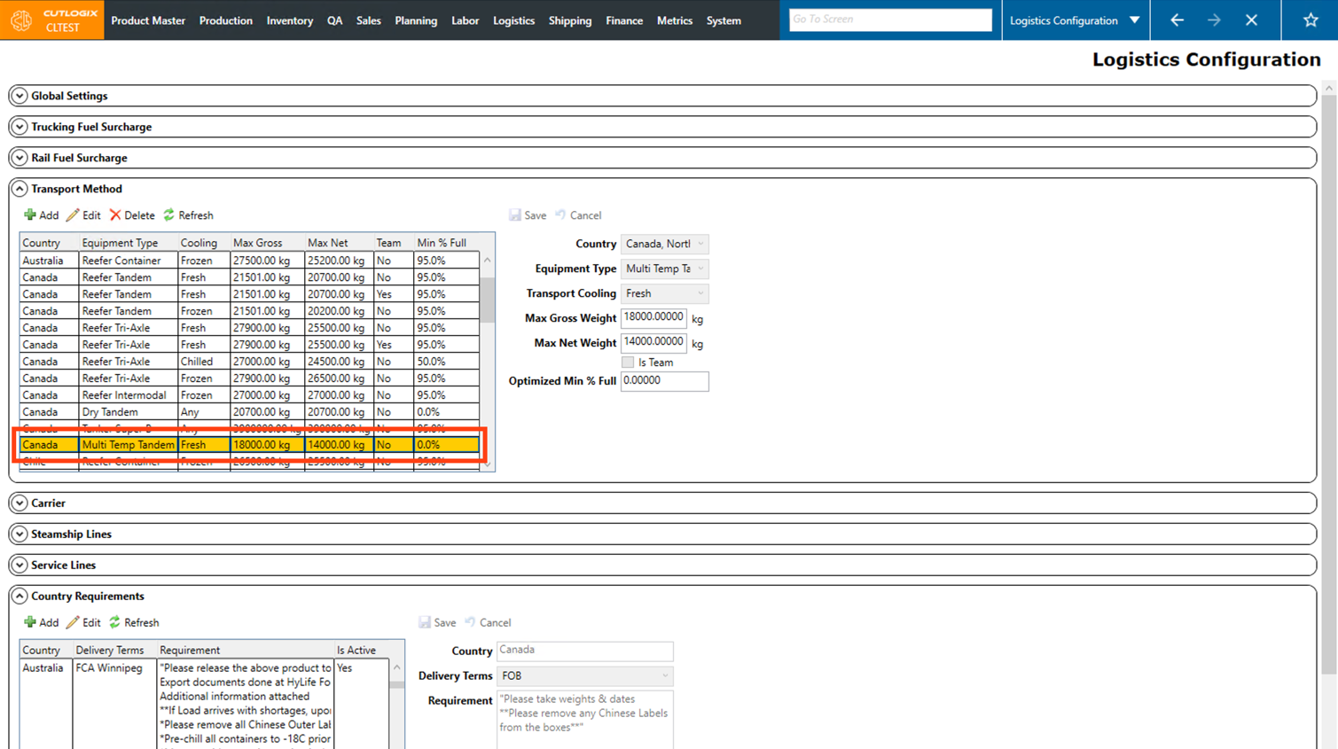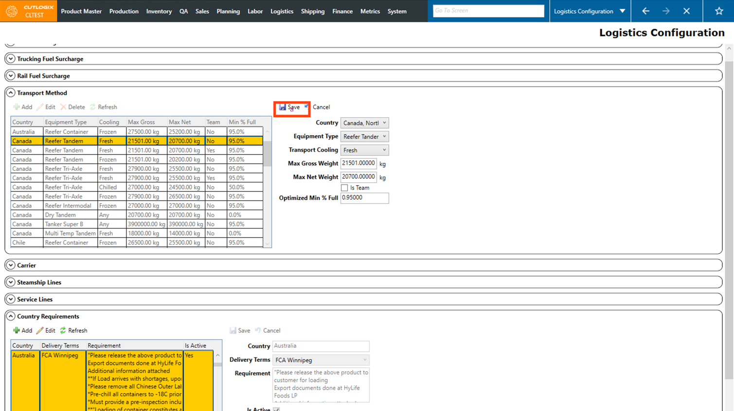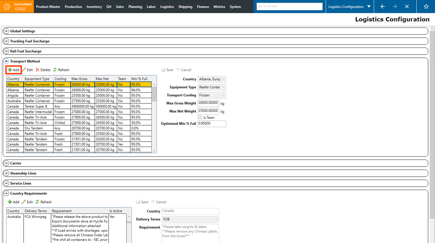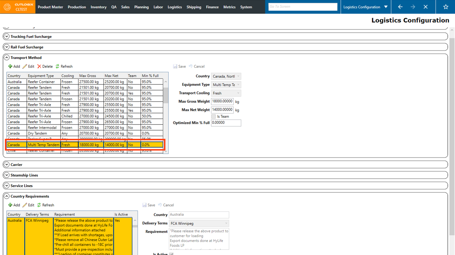 • Transport Cooling: Choose the type of cooling that this transport method is for, from the dropdown list. (Any, Fresh, Frozen, Chilled).