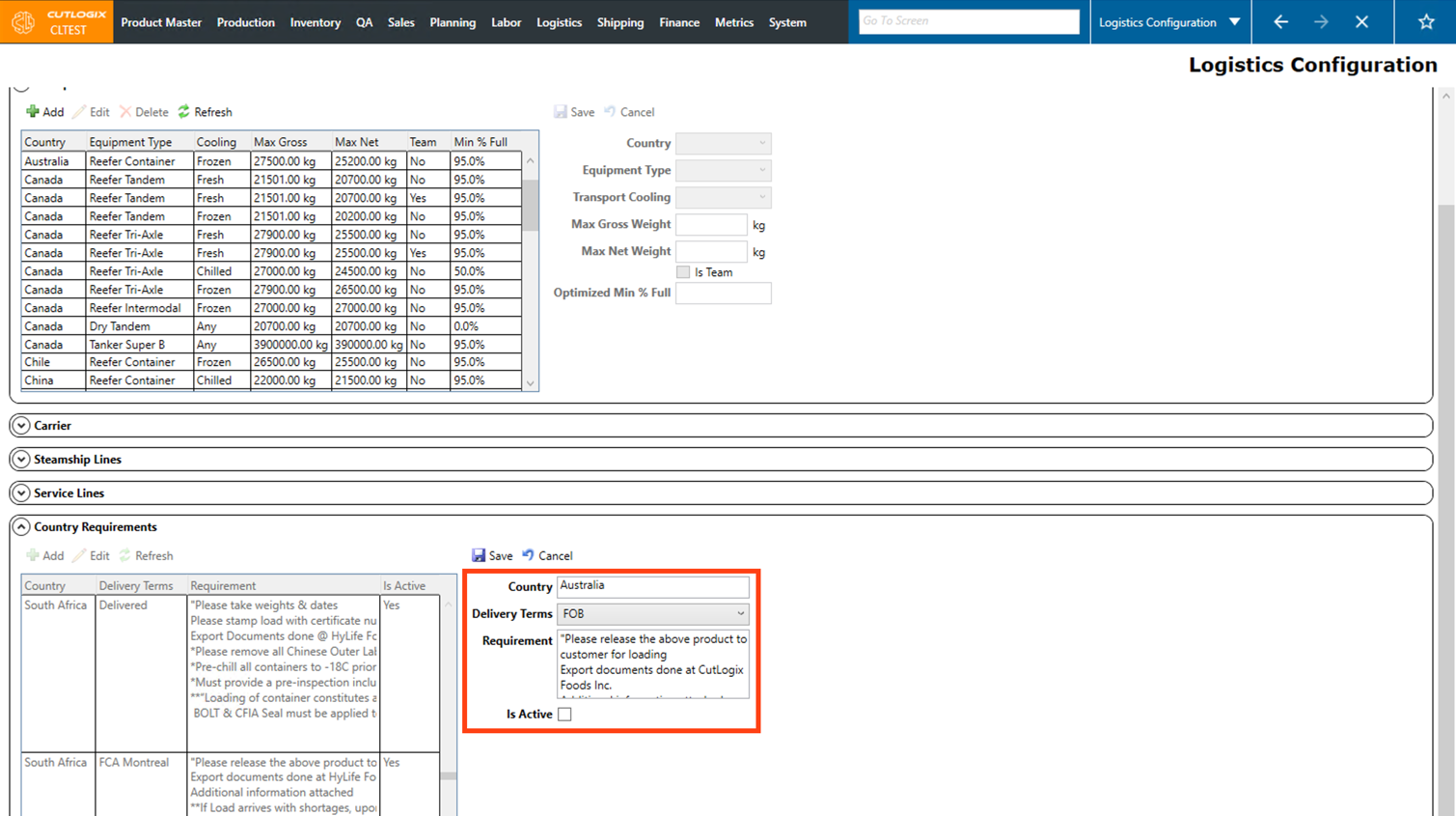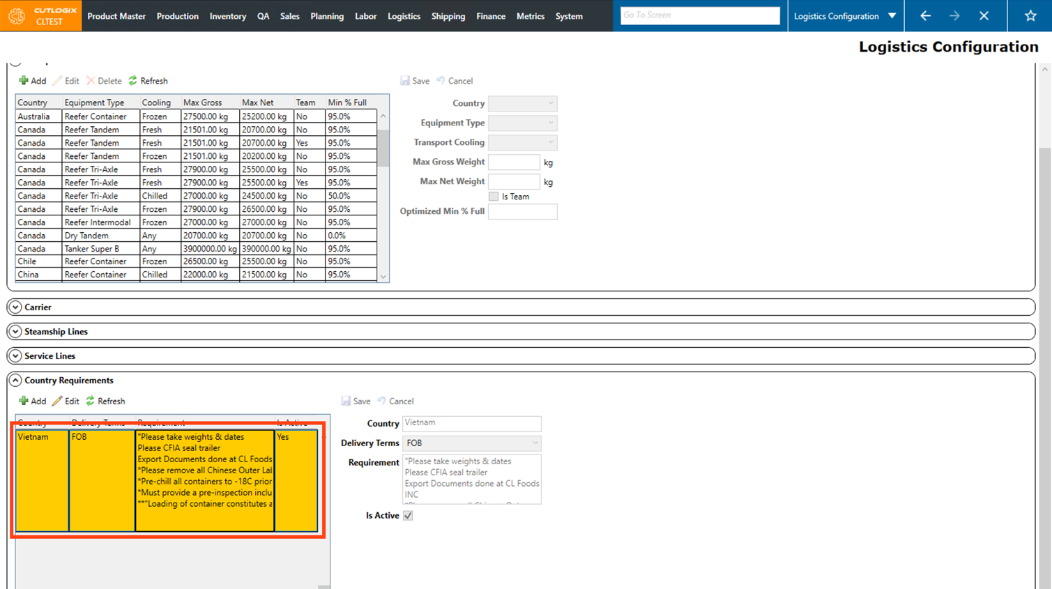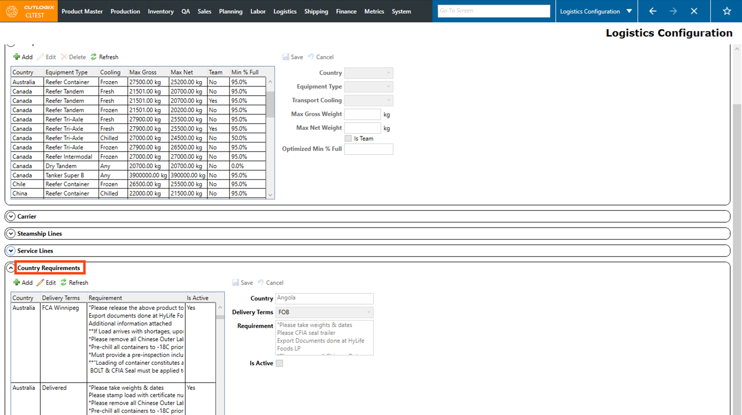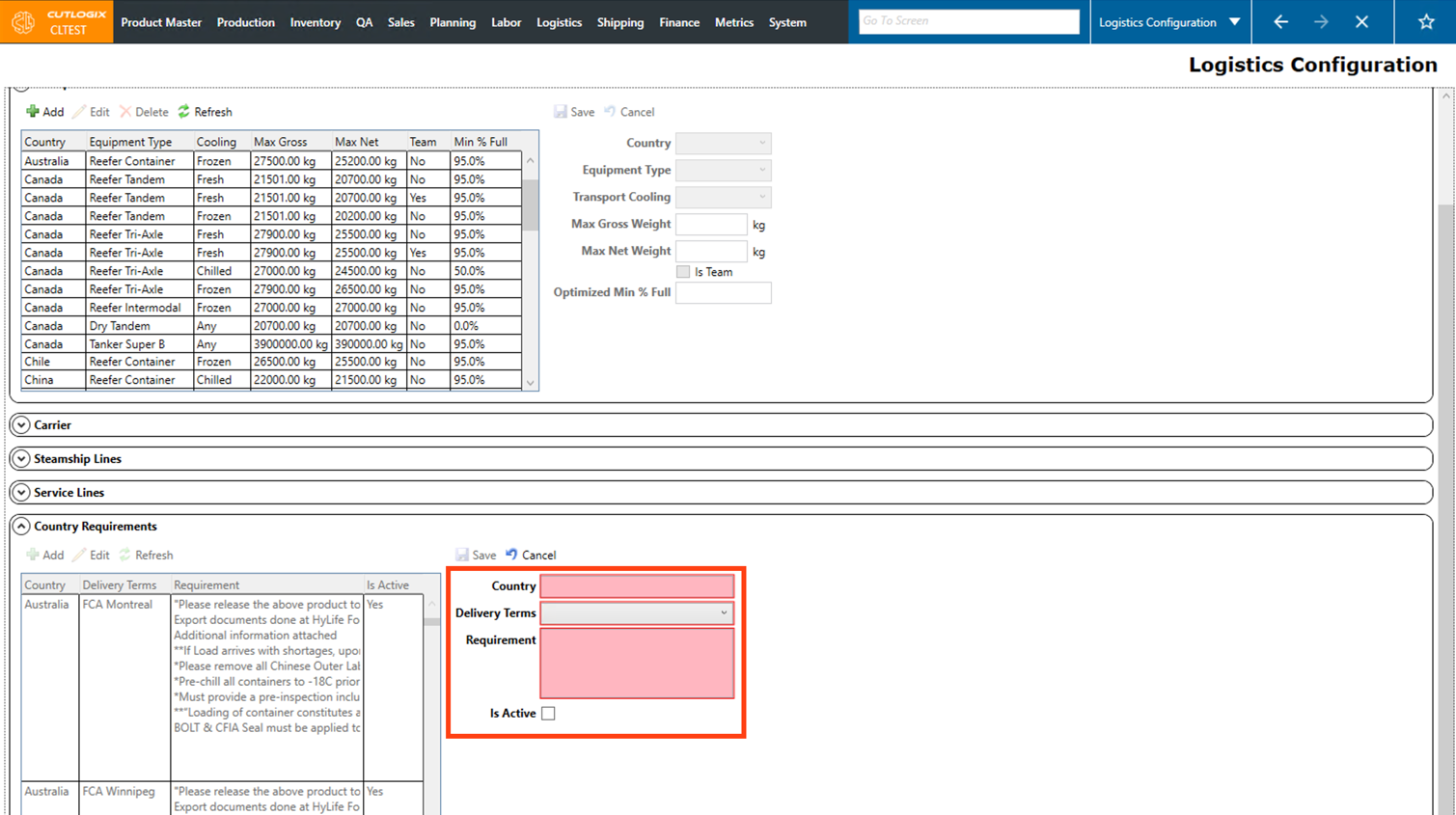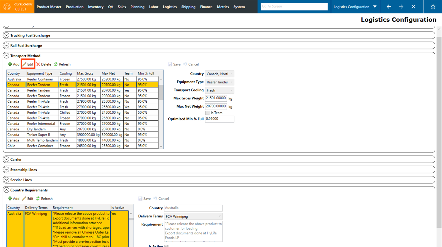 • Transport Cooling: Choose the type of cooling that this transport method is for, from the dropdown list. (Any, Fresh, Frozen, Chilled).