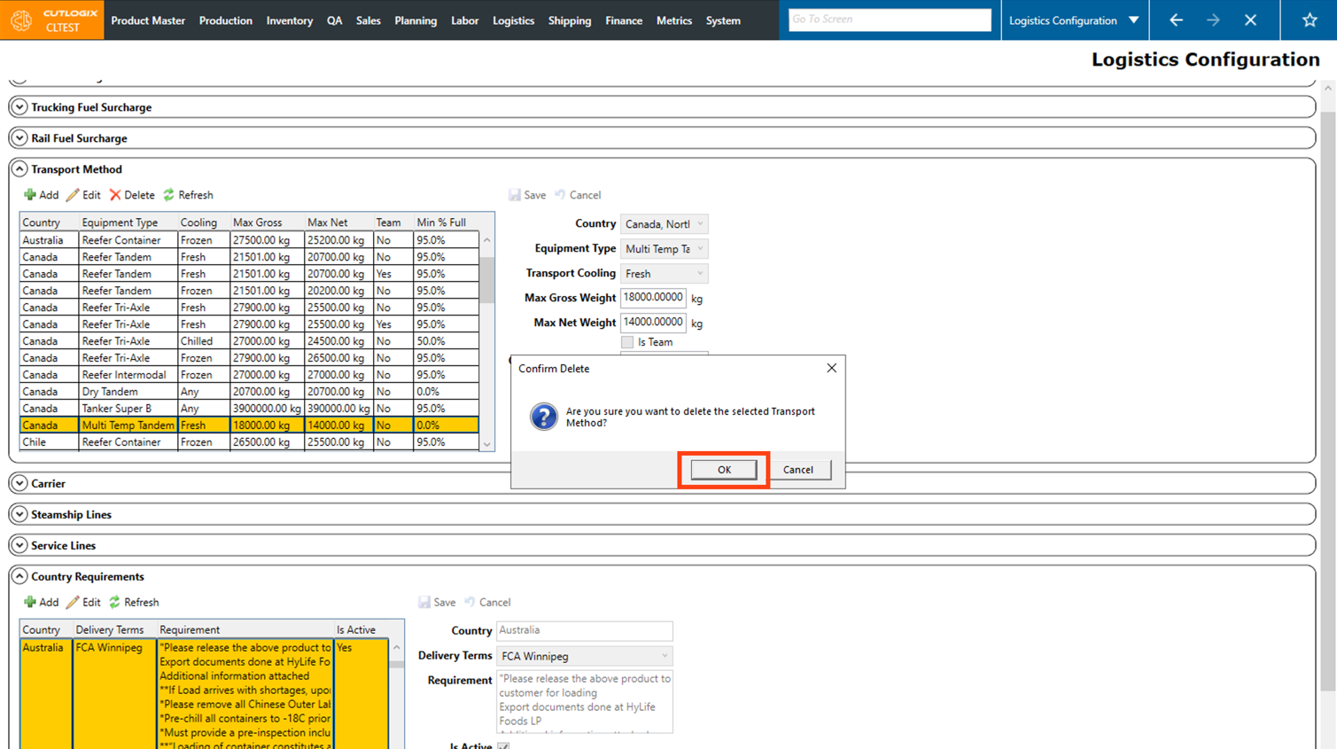 Step 5: A confirmation dialog will appear, asking if you're sure that you want to delete the transport method. Click "OK" to proceed with deleting it. The transport method will then be deleted & removed from the list.
