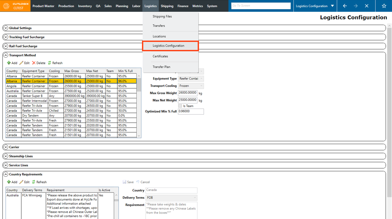 DemoStep 1: Navigate to the "Logistics Configuration" page (Under the Logistics menu → Logistics Configuration).