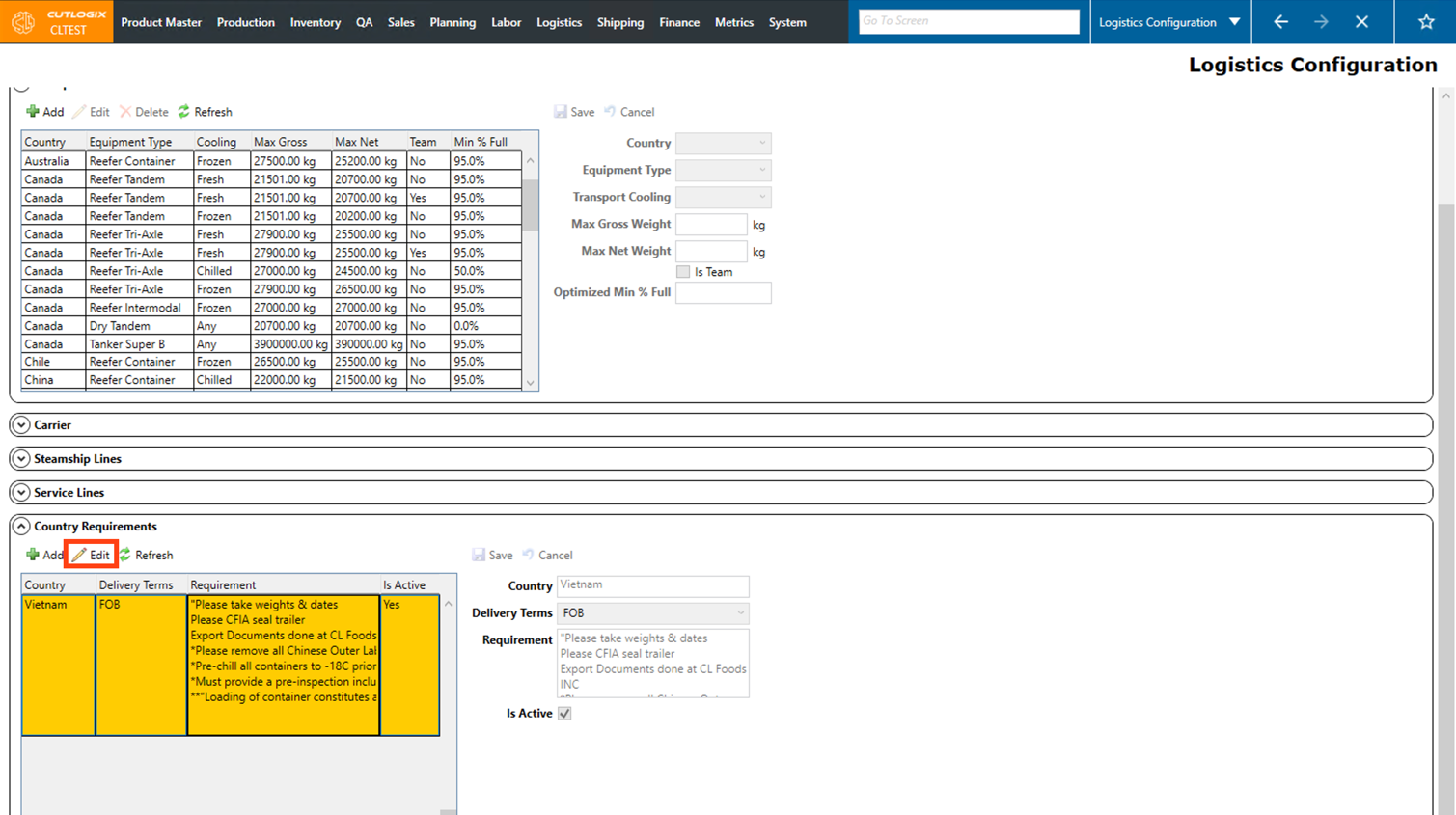 Step 5: The fields on the right side of the page will be enabled for editing the attributes of the country requirement. Make any necessary changes to the requirement here.