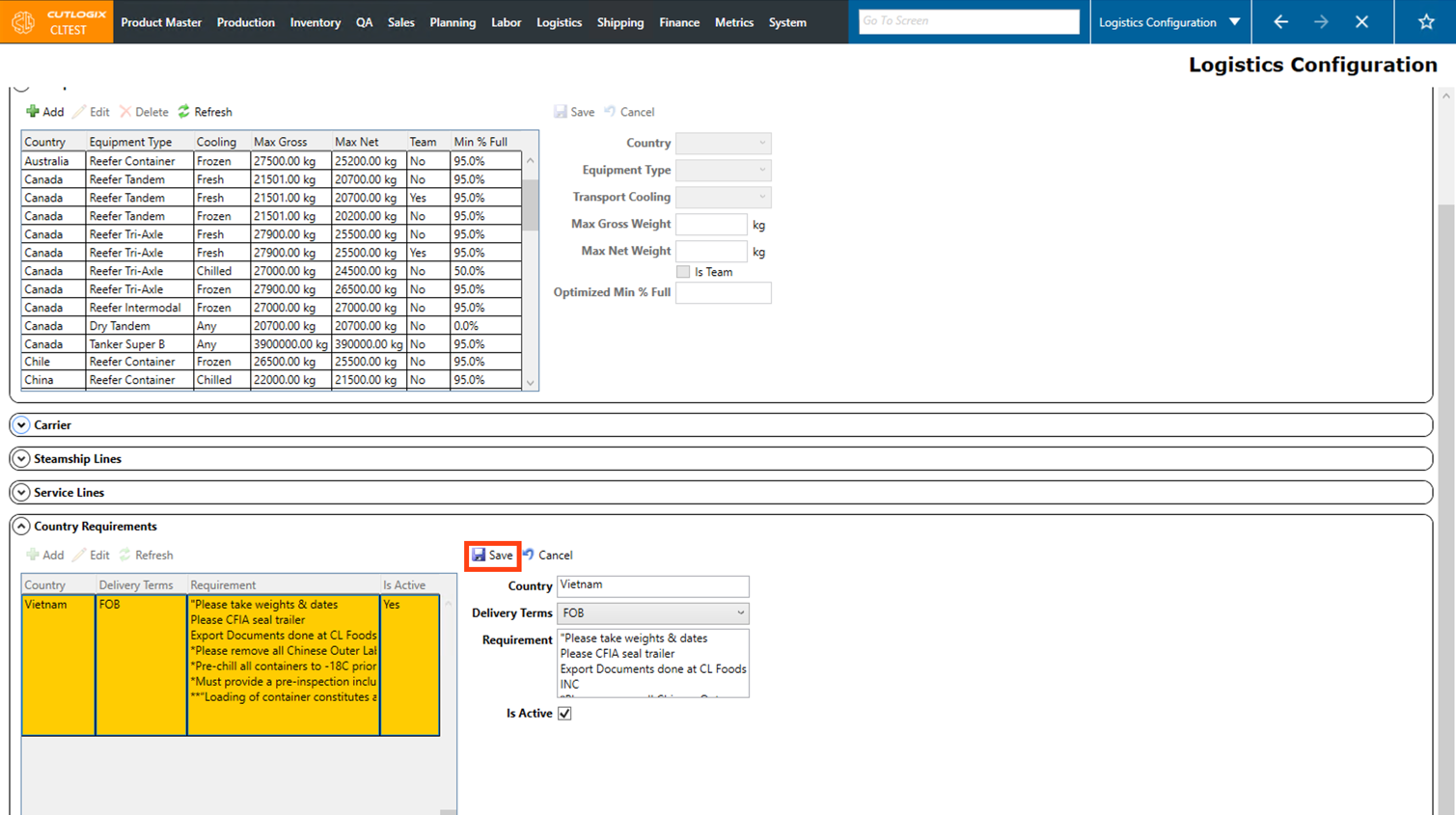 Step 5: Once all the required information has been filled out, click the "Save" button at the top of the input fields. The new country requirement will now appear in the country requirement list.