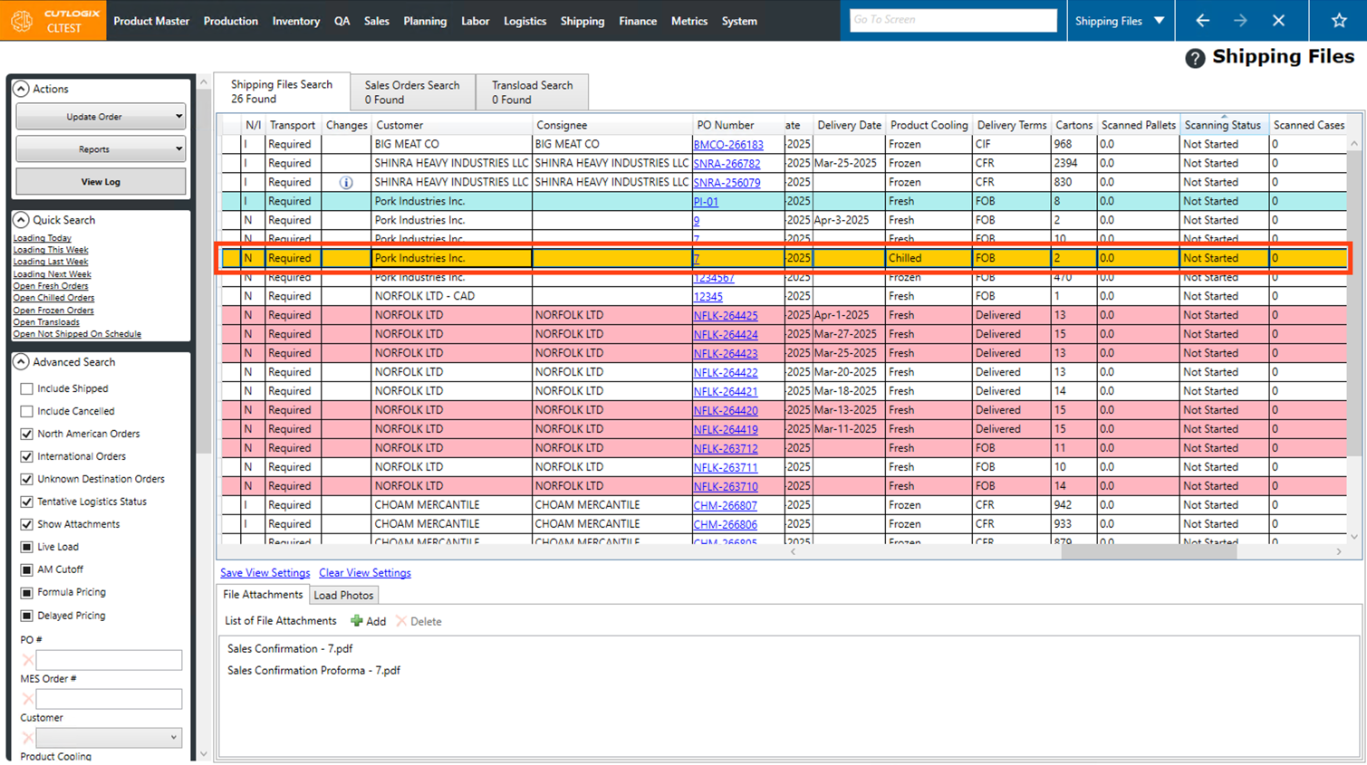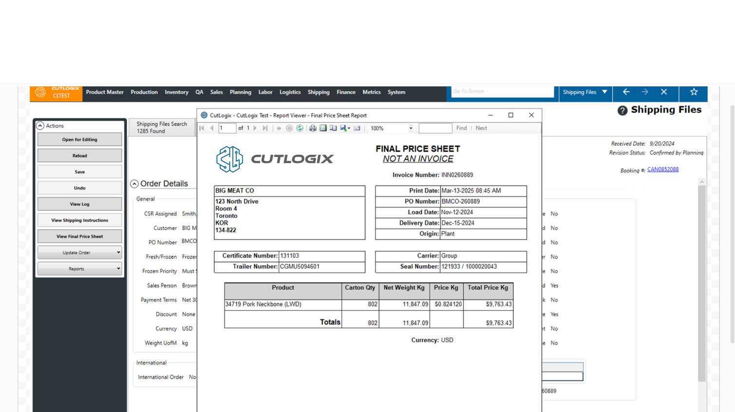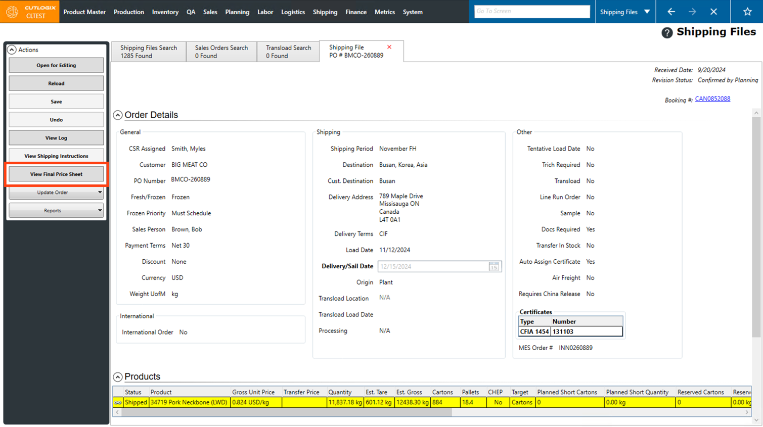 Step 2: This will bring up a list of shipping files. Shipping files are customer orders, displayed slightly differently with a focus on surfacing information important to logistics staff. Double-click on a shipping file that you want to view the final price sheet for, or click on the PO Number for the shipping file.