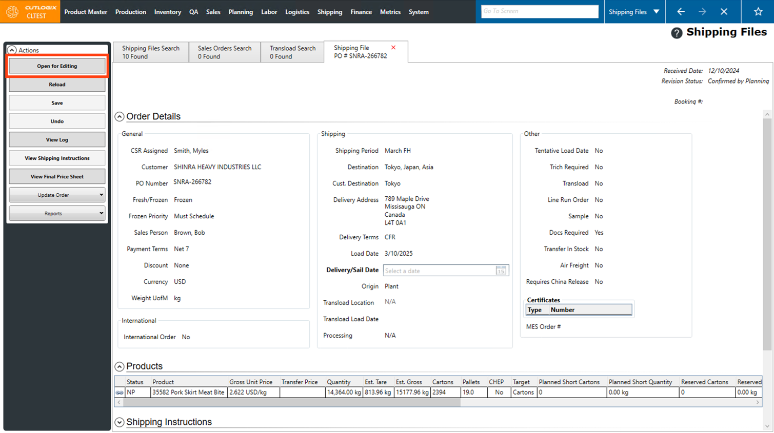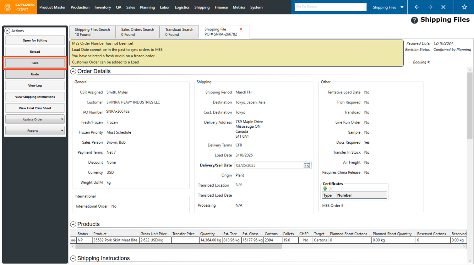 Step 4: Editing will then be enabled on the shipping file. You can make changes to shipping specific data on the shipping file, such as the delivery/sail date, certificates, shipping instructions, logistics notes and attachments. Changes cannot be made to the general order details or the products on the order.