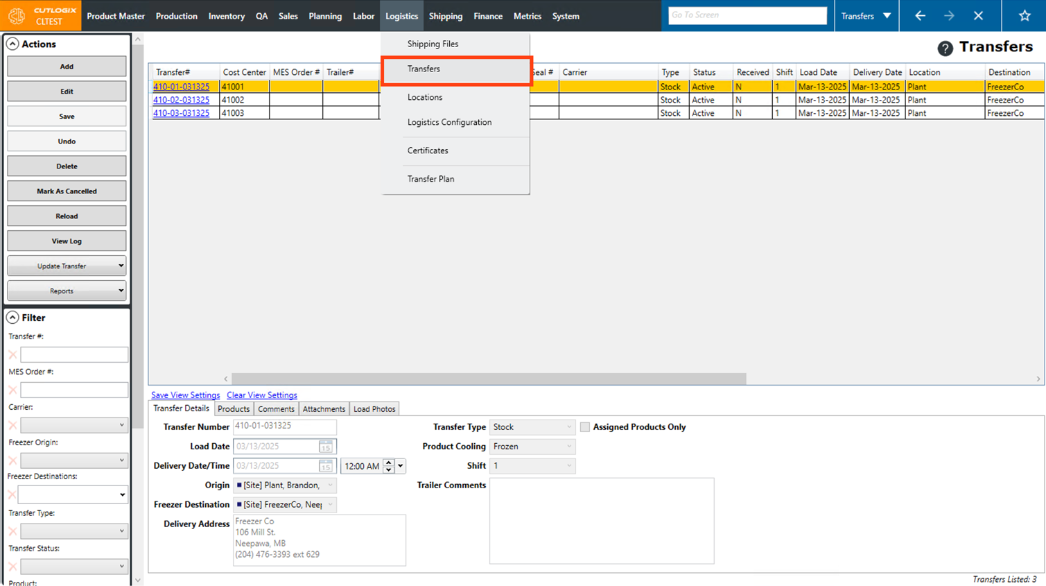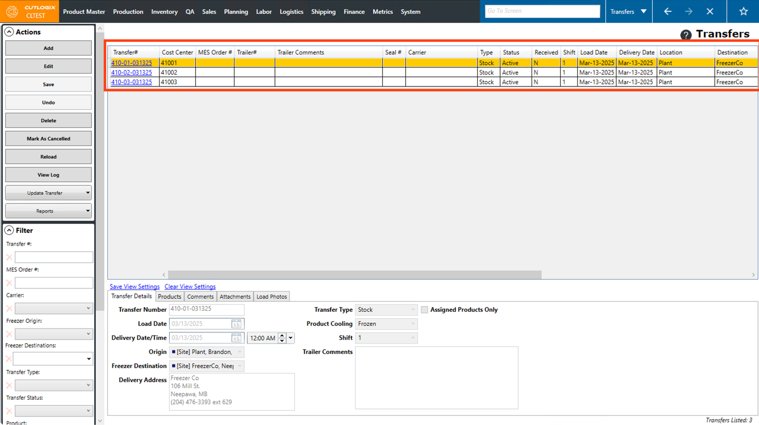 Step 11: Now we can see the 3 transfers that we told CutLogix to create. These transfers are similar to customer orders in that they have a list of products, will have products scanned on to them, can be marked as shipped, synced to the MES & more.