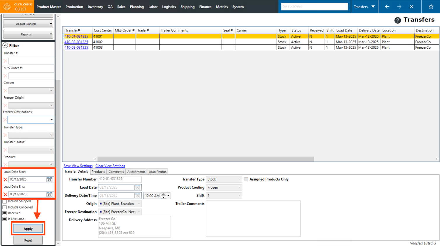 Step 10: Next, we'll set "Load Date Start" and "Load Date End" dates on the filter to the day we set the transfers to be created on, then we'll click "Apply" to apply the filter to the page.