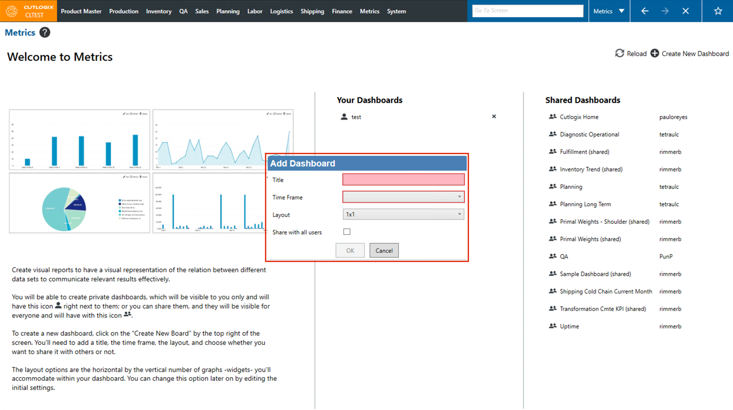 Step 2: A popup will appear, asking you for information about the new dashboard. Fields highlighted in red are required and must be entered before the dashboard can be created. These fields are as follows: