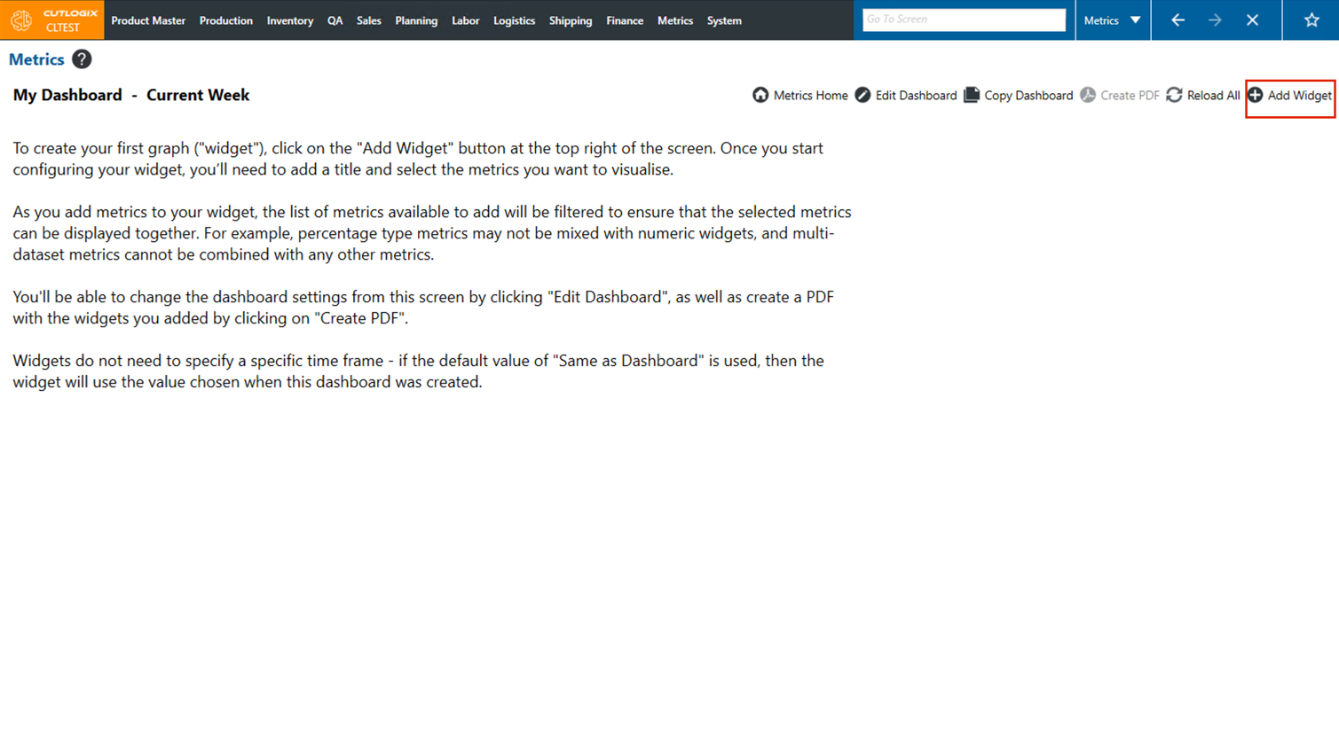 Step 3: Click "OK" to save the new dashboard. You will then be taken to the page for your dashboard where you can then start adding widgets.
