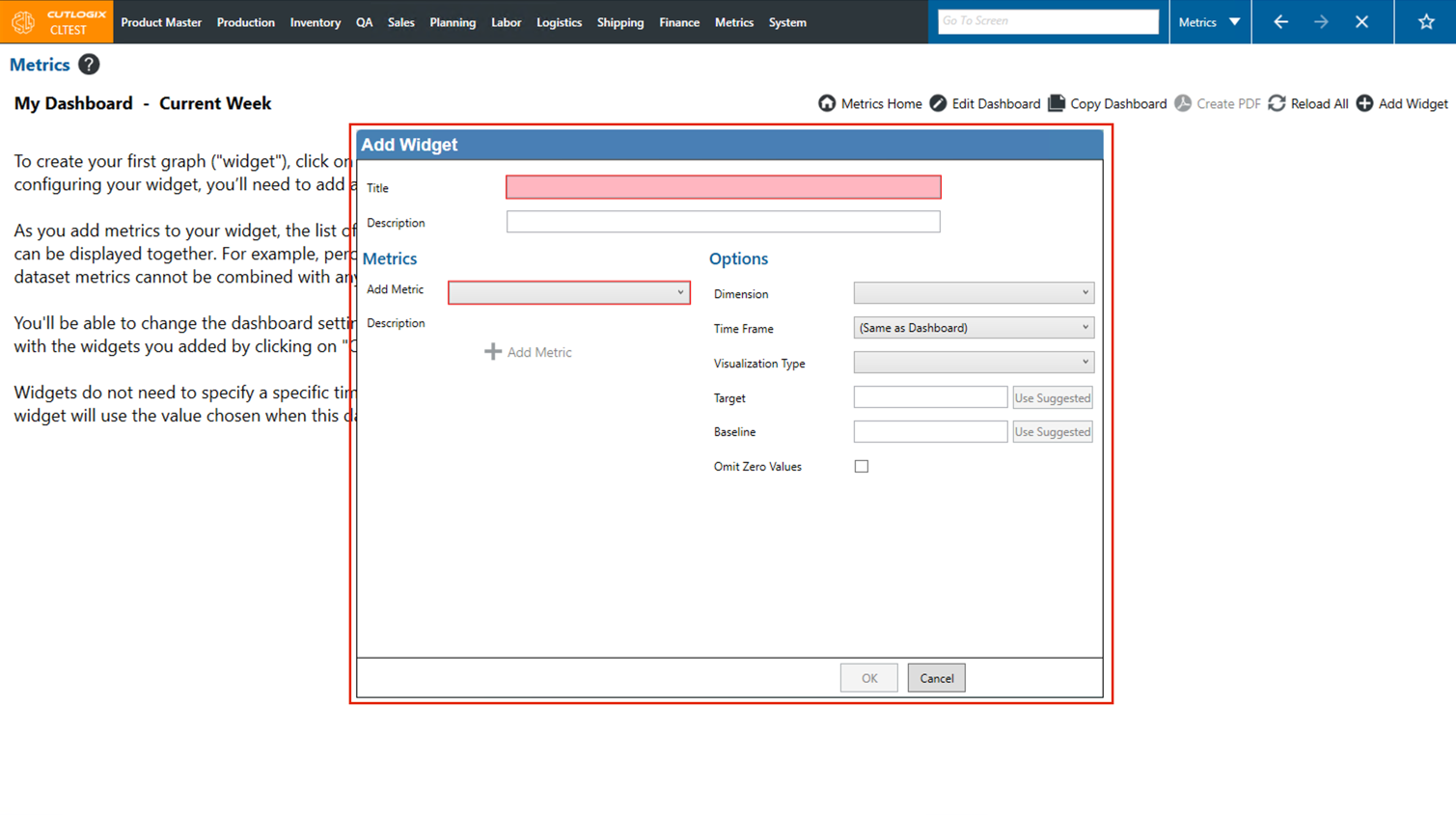 Step 3: The "Add Widget" dialog will appear. On here you can enter information and details about the new widget that you want to add to your dashboard. Fields highlighted in red are required and must be filled out before the widget can be saved, these fields are as follows: