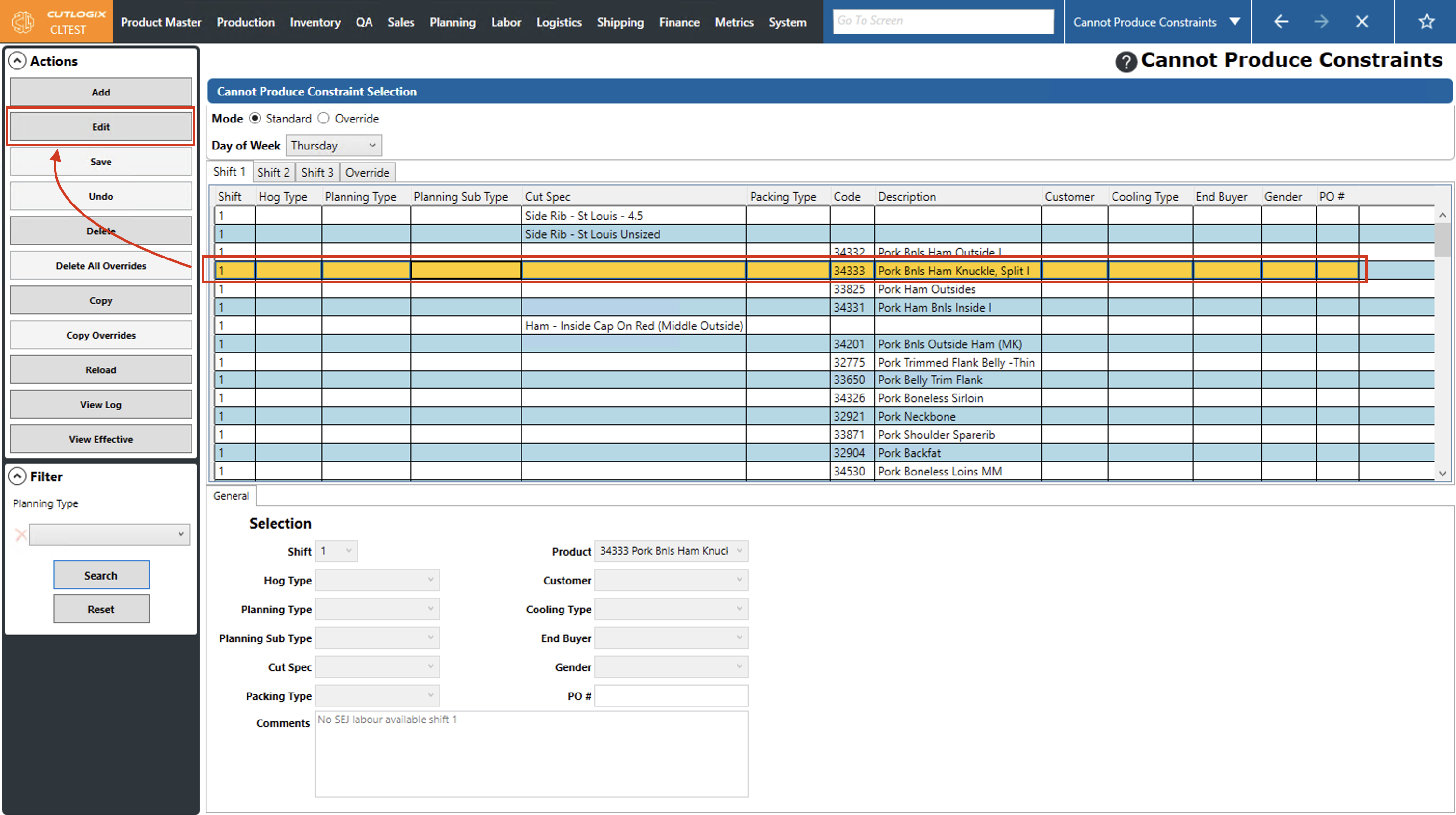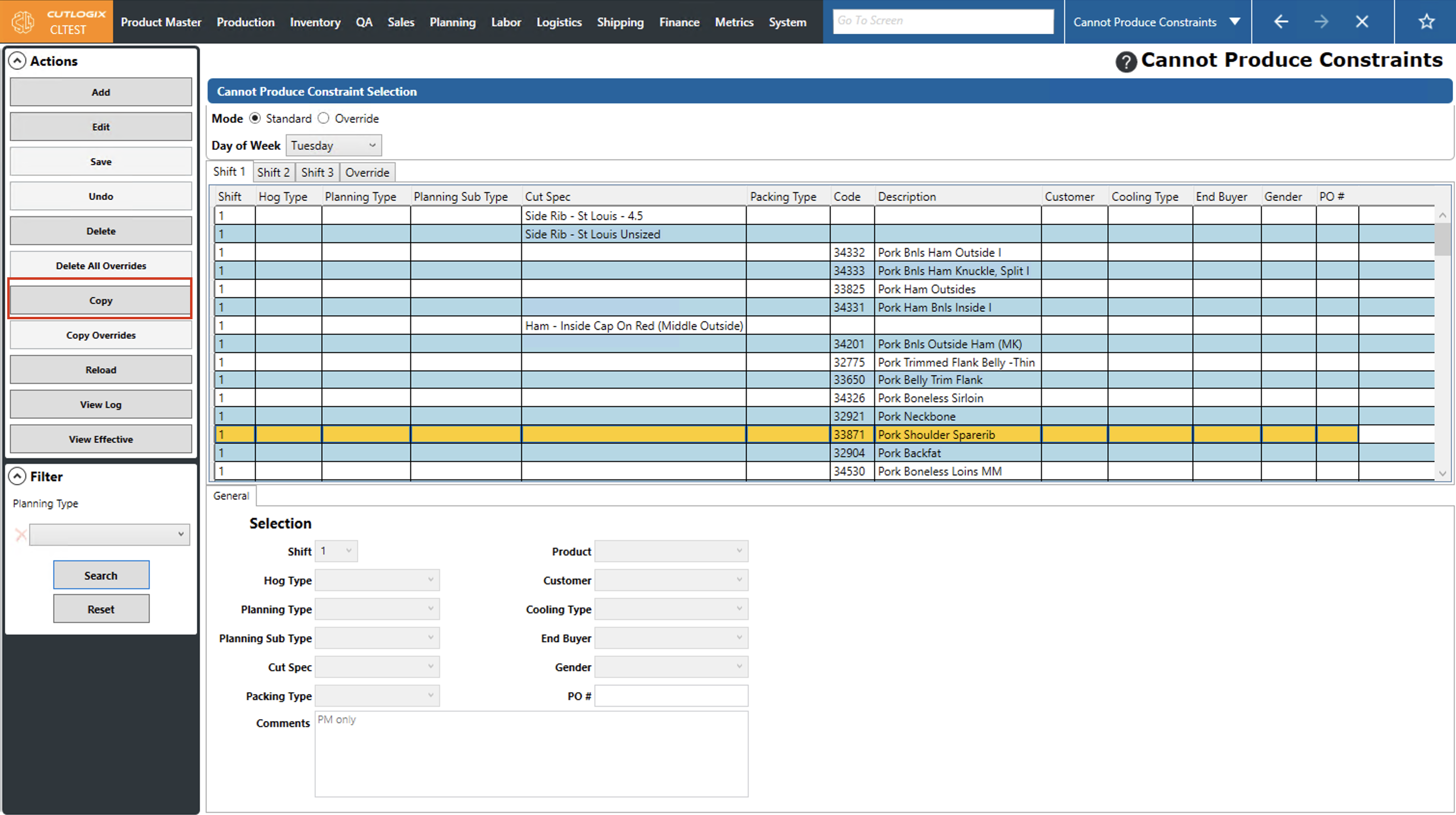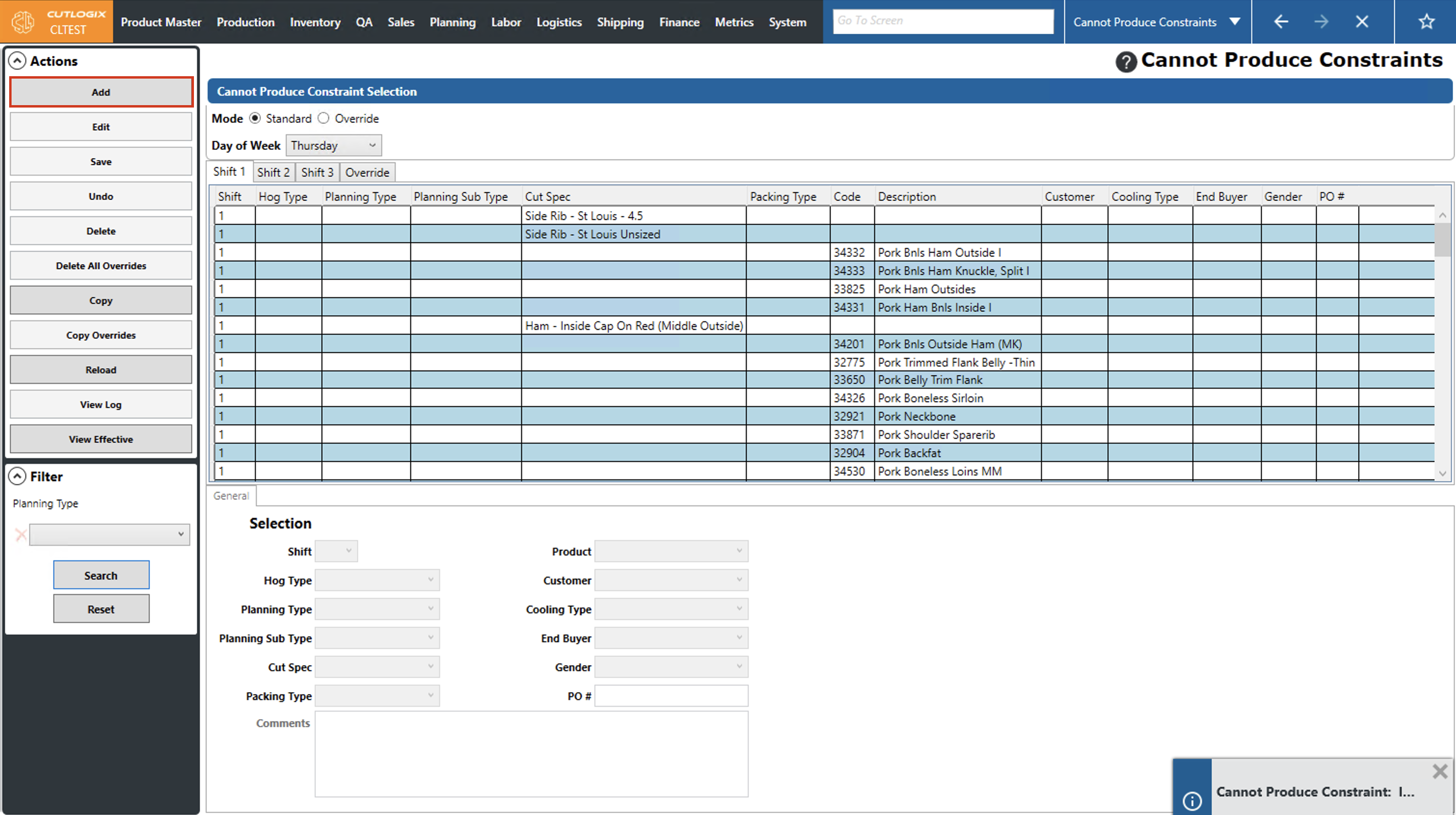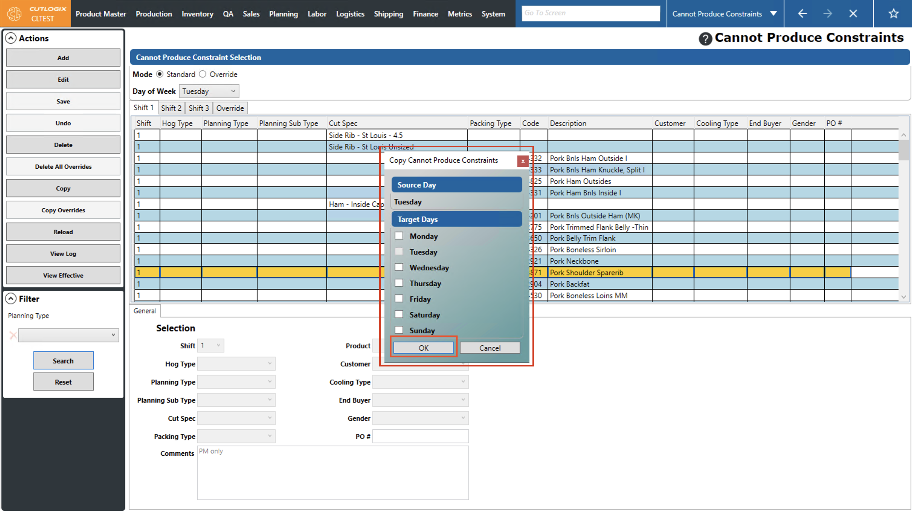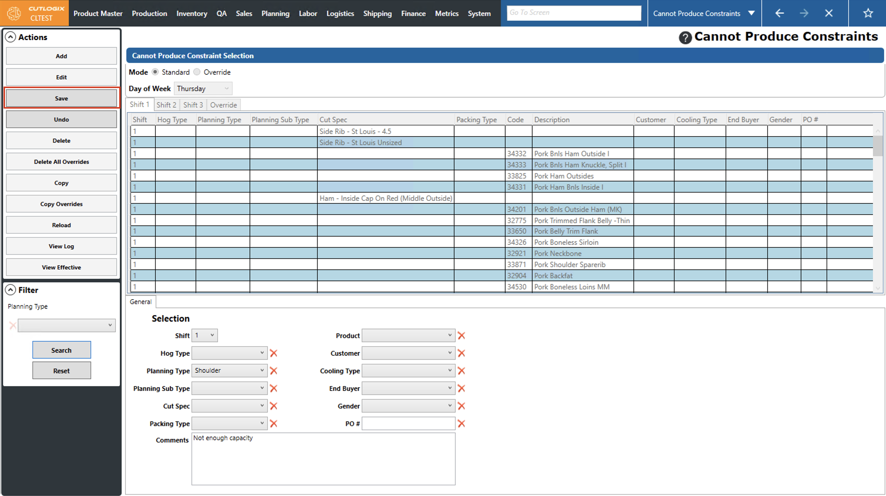 DemoStep 1: Navigate to the "Cannot Produce Constraints" page (Under the Planning menu → Planning Rules Config → Cannot Produce Constraints). Select the day of the week that you want to modify a cannot produce constraint for from the "Day of Week" dropdown list and choose the corresponding shift tab that has the constraint that you want to modify.