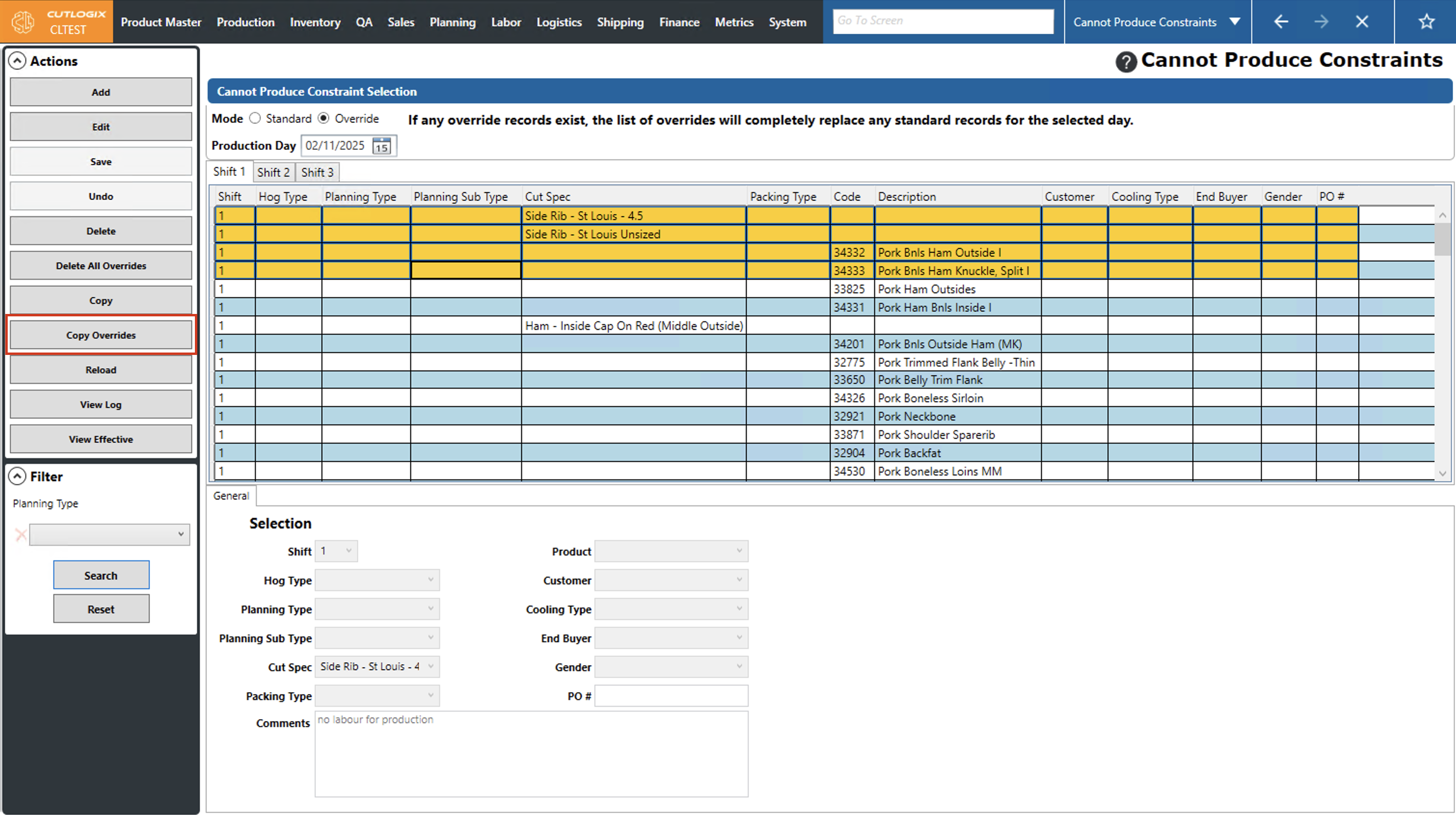 DemoStep 1: Navigate to the "Cannot Produce Constraints" page (Under the Planning menu → Planning Rules Config → Cannot Produce Constraints). Click on the "Override" option, then choose the production day that you want to copy overrides from by using the "Production Day" datepicker (click on the calendar icon).