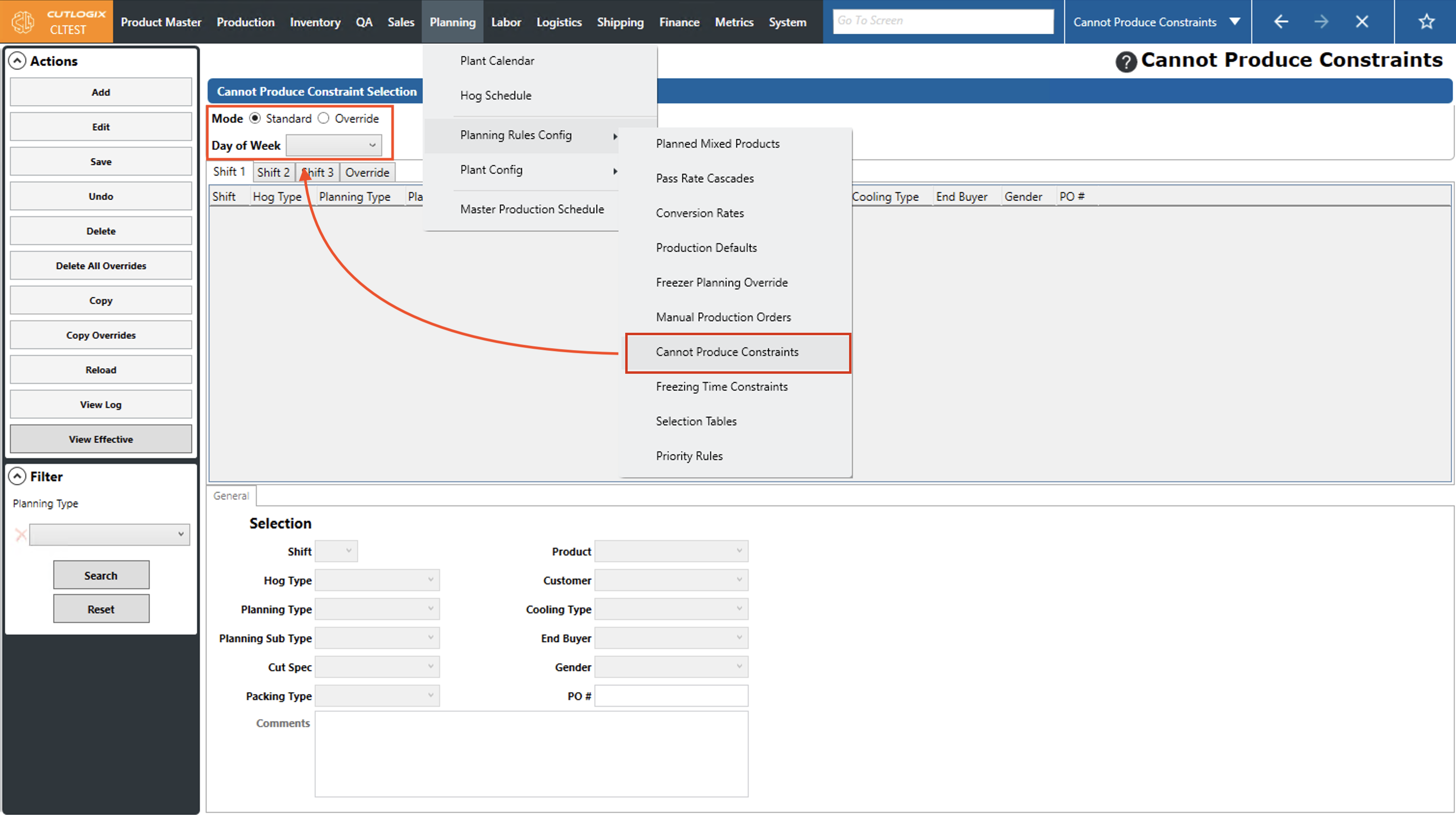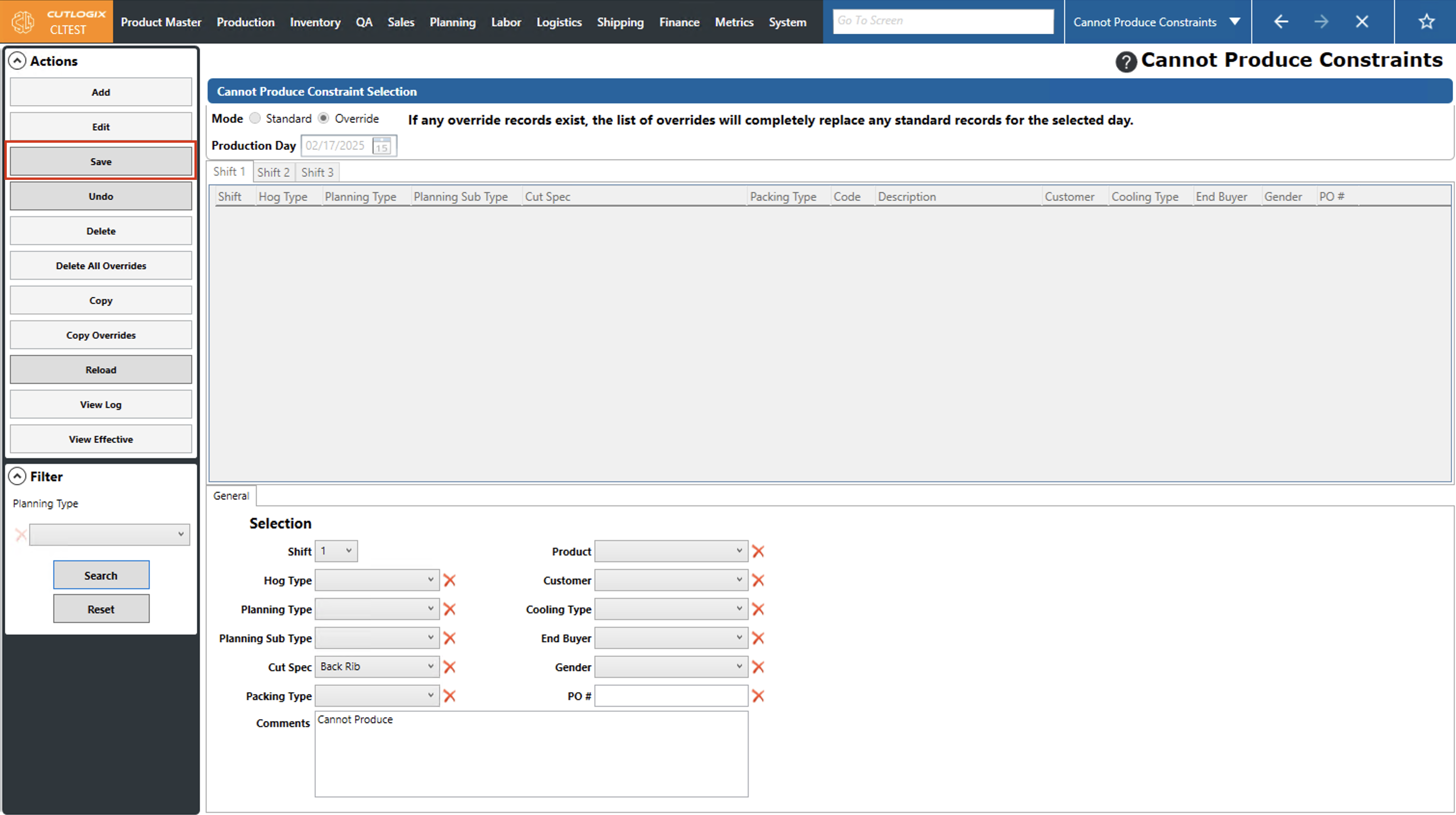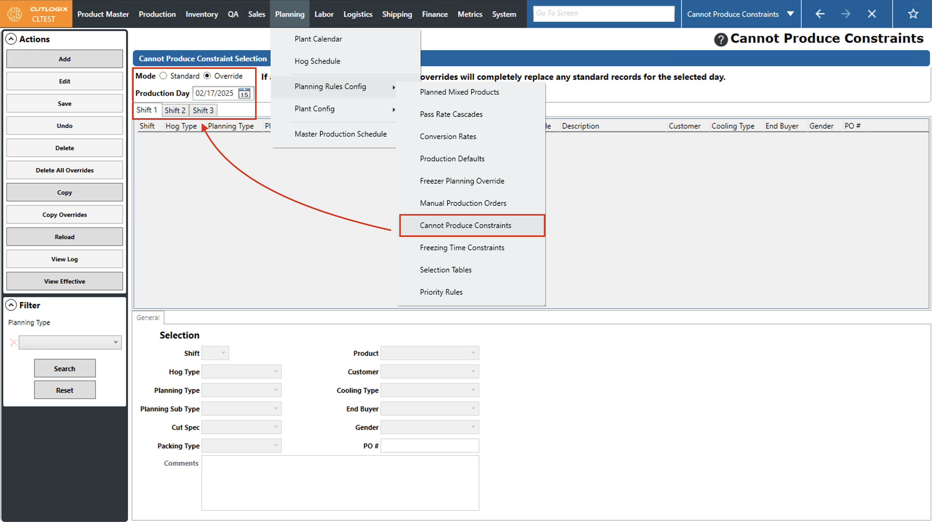 DemoStep 1: Navigate to the "Cannot Produce Constraints" page (Under the Planning menu → Planning Rules Config → Cannot Produce Constraints), then click on the "Override" option and choose a production date using the datepicker and the shift using the shift tabs.