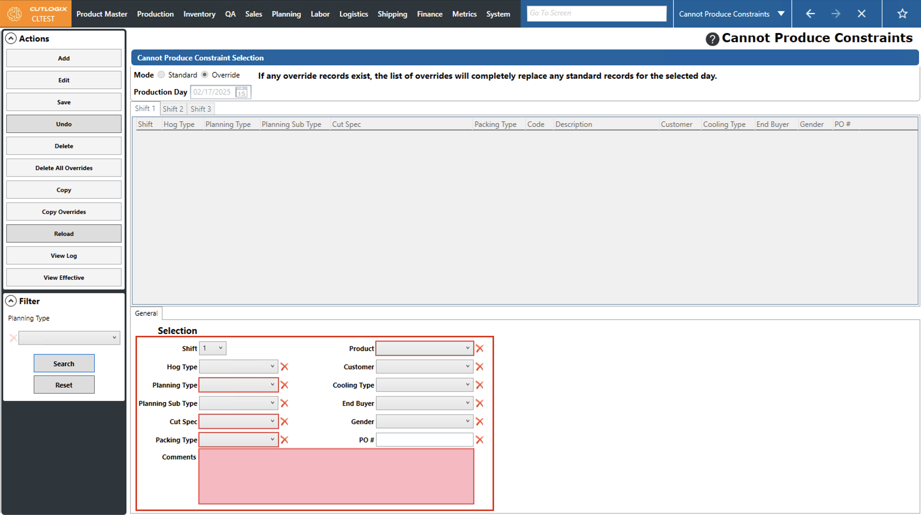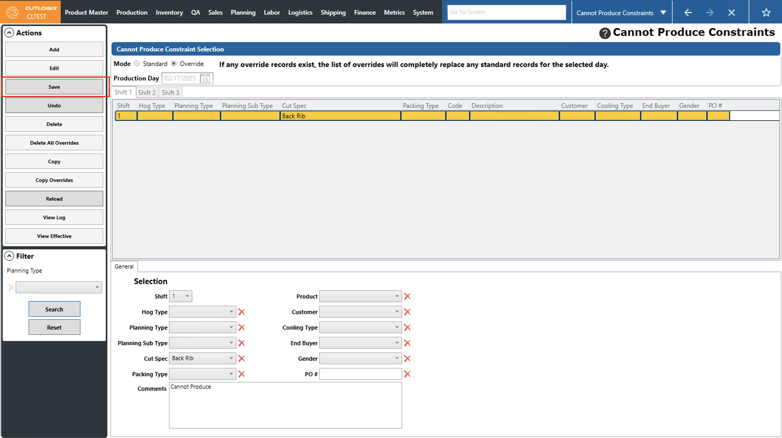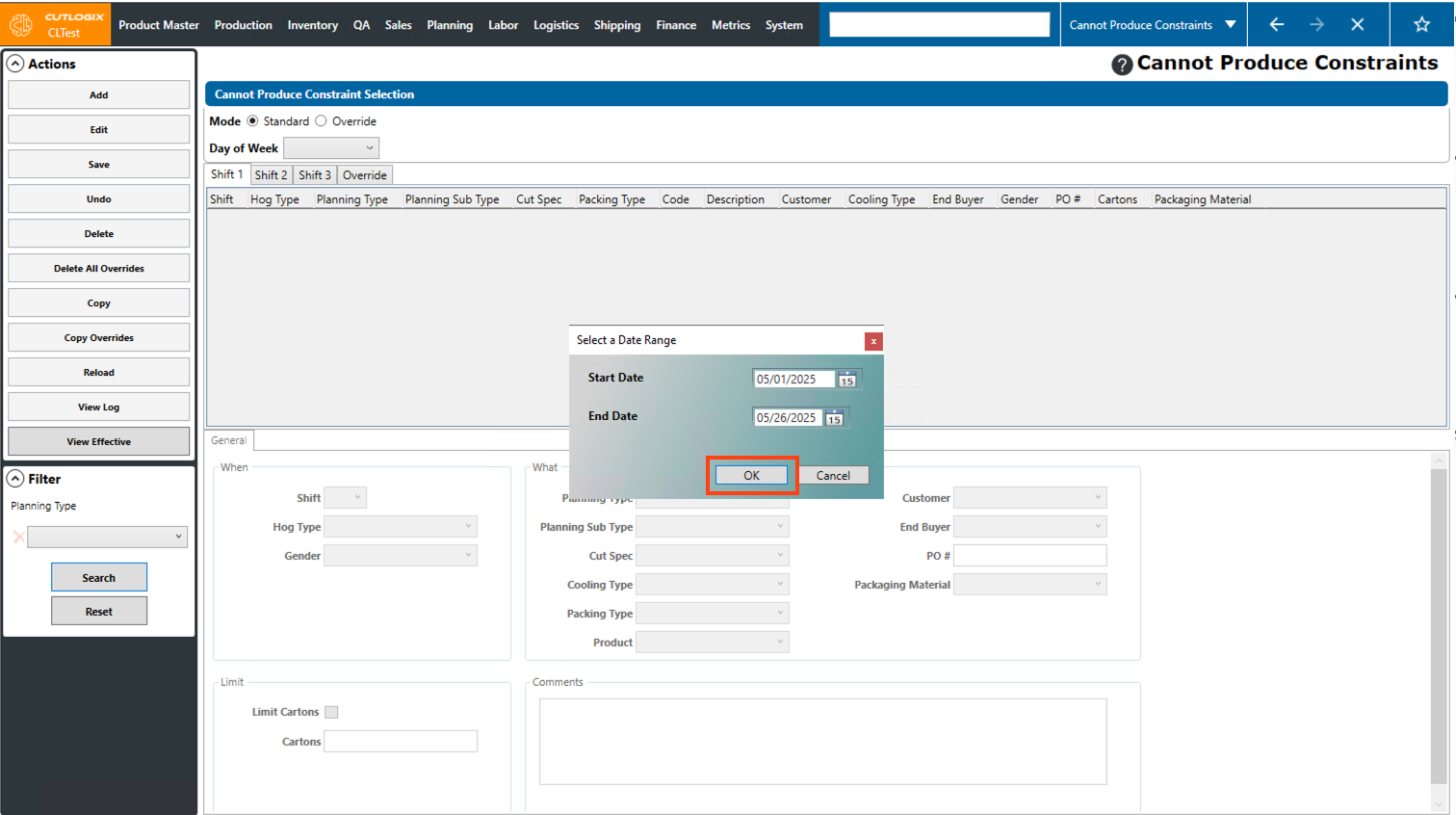 DemoStep 1: Navigate to the "Cannot Produce Constraints" page (Under the Planning menu → Planning Rules Config → Cannot Produce Constraints), then click on the "Override" option and choose a production date using the datepicker and the shift using the shift tabs.