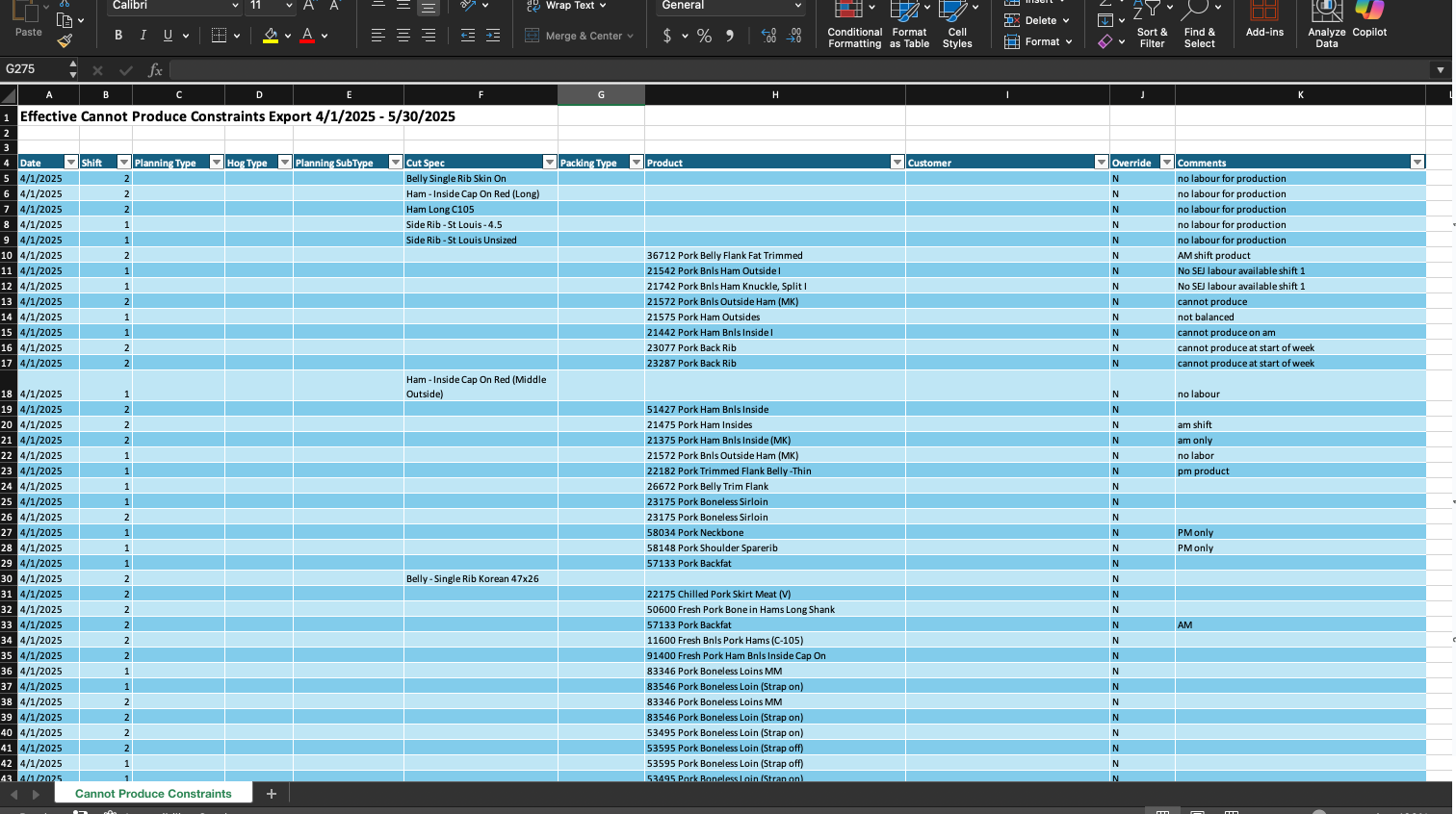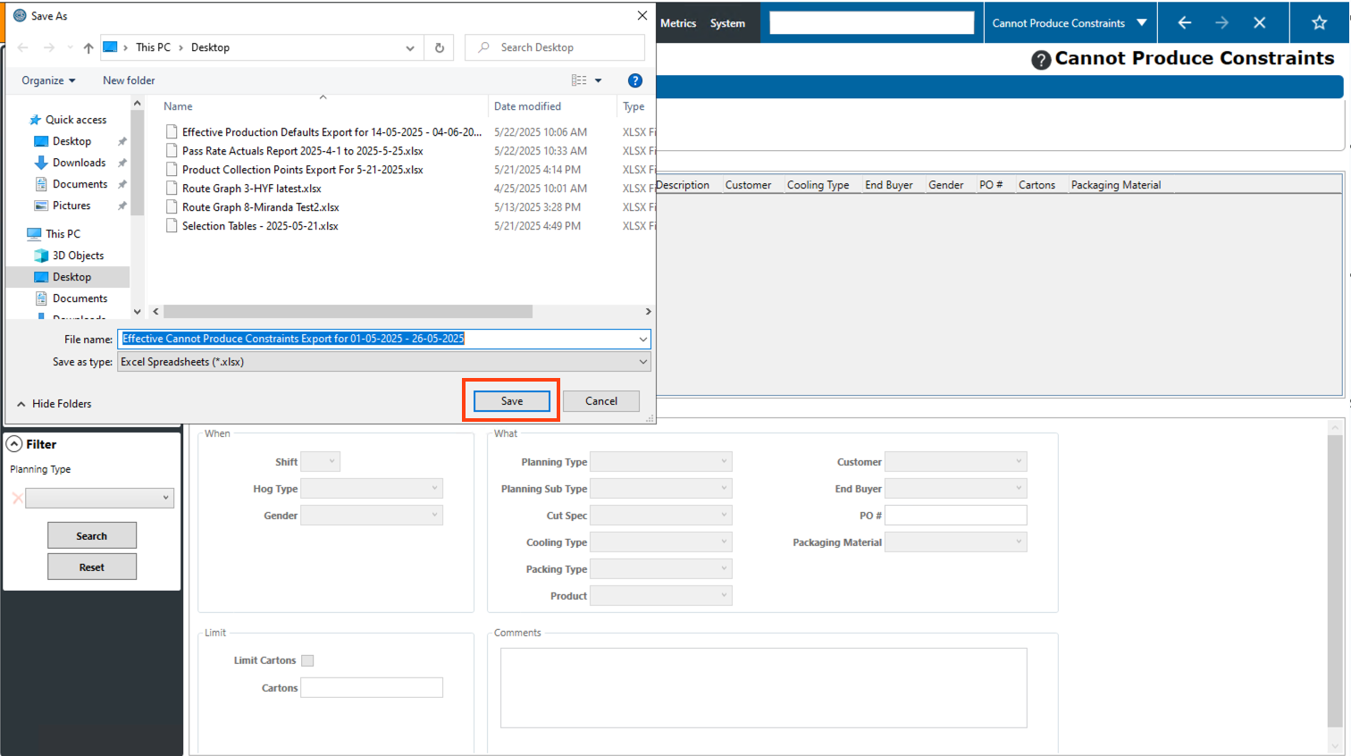 Step 5: Navigate to the location on your computer where you saved the file and open it. Note: You will need to have excel installed on your computer to open the file. Once open, the file will display a table with all of the cannot produce constraints from within the selected timeframe. The timeframe that the report was generated for will also be displayed at the top of the report.