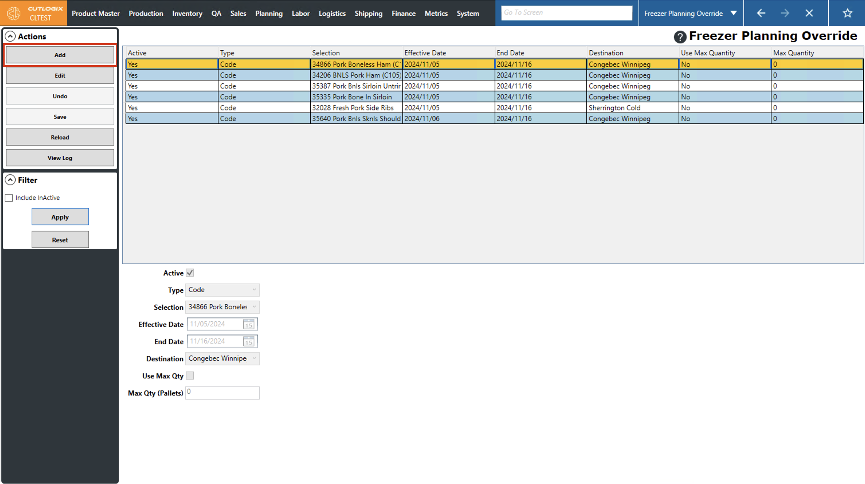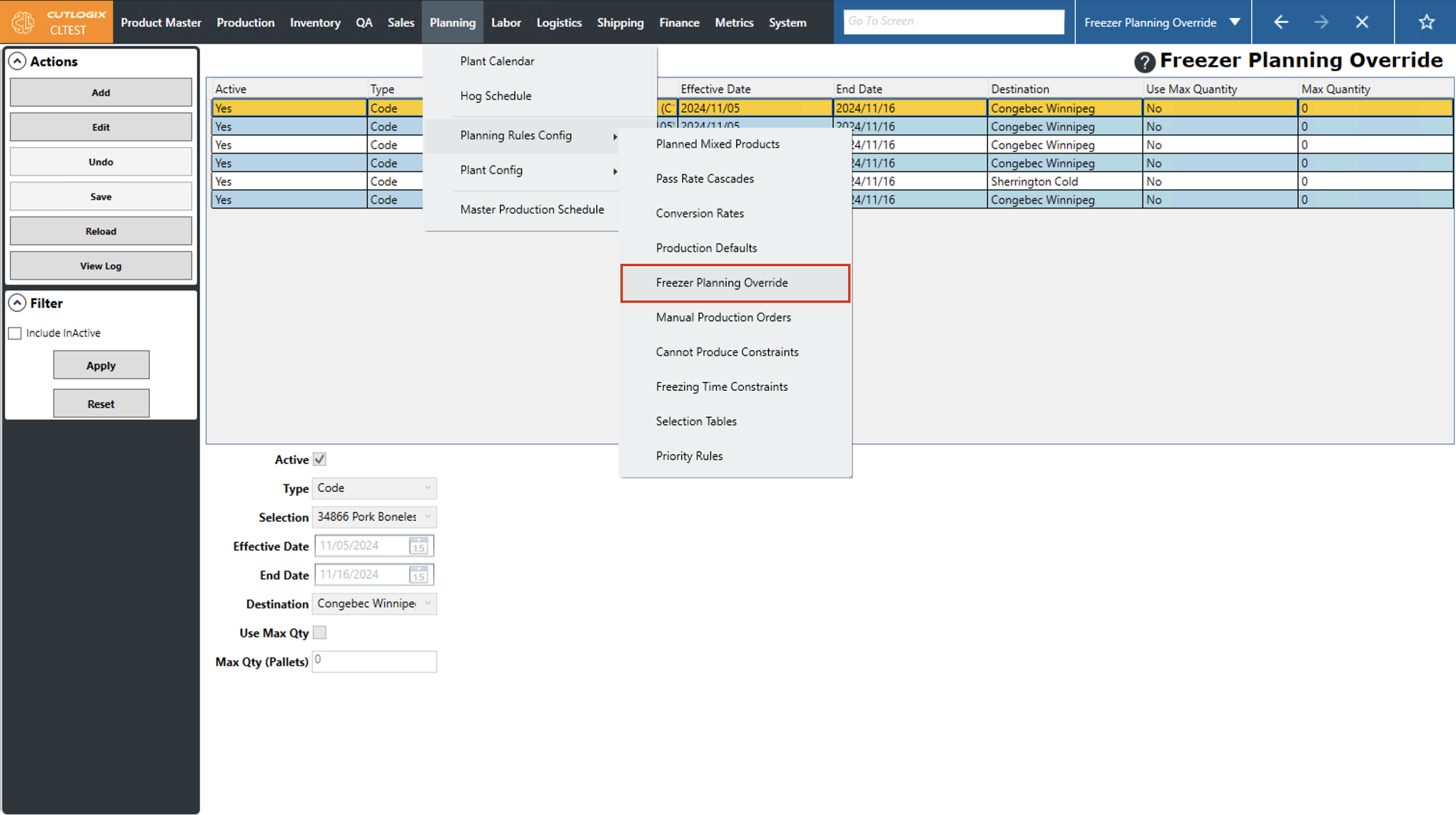 DemoStep 1: Navigate to the "Freezer Planning Override" page (Under the Planning menu → Planning Rules Config → Freezer Planning Override).