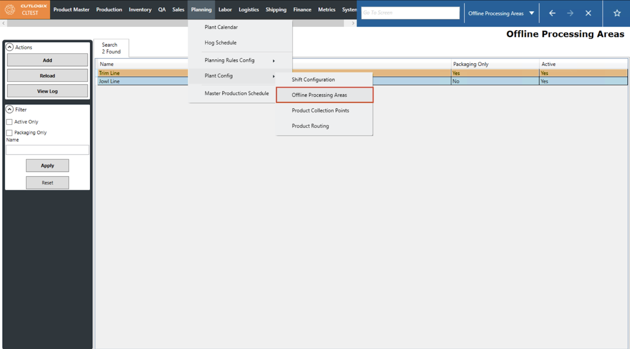 DemoStep 1: Navigate to Planning > Plant Config > Offline Processing Areas.