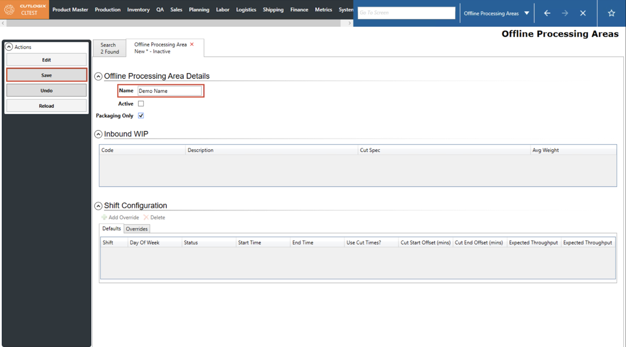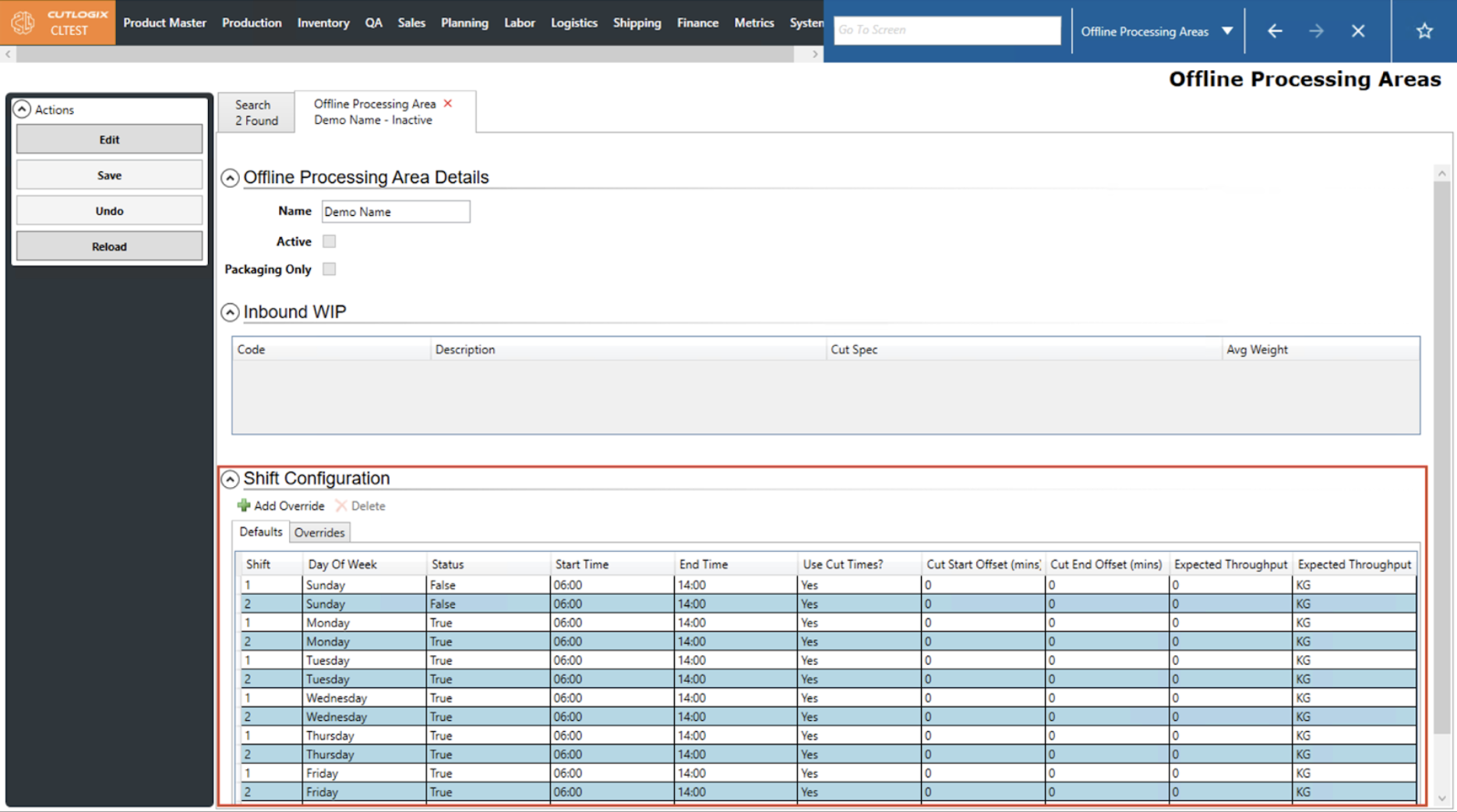 DemoStep 1: Navigate to Planning > Plant Config > Offline Processing Areas and double-click the offline processing area you want to edit to open its details tab.