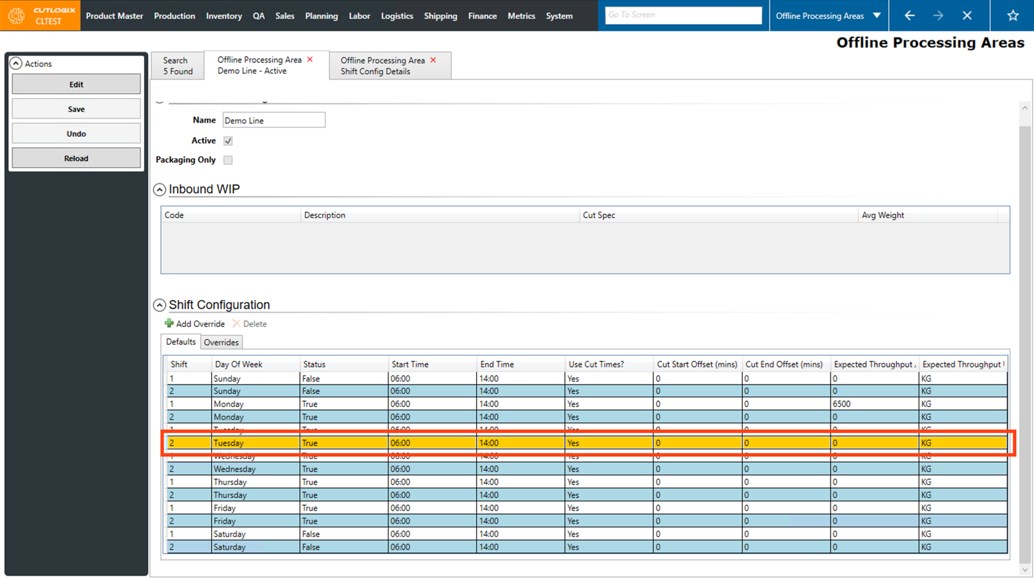 DemoStep 1: After saving a new Offline Processing Area, the default shift configs will be populated with a series of default values. If you are still on the details page after adding a new offline processing area, proceed to step 2.