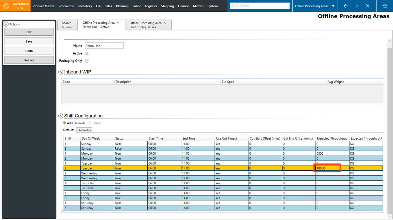 Step 4: Now you can make changes to the shift start and end times, cut shift offsets, active/inactive status and expected throughput per hour. Note that the expected throughput per hour must be greater than zero.
