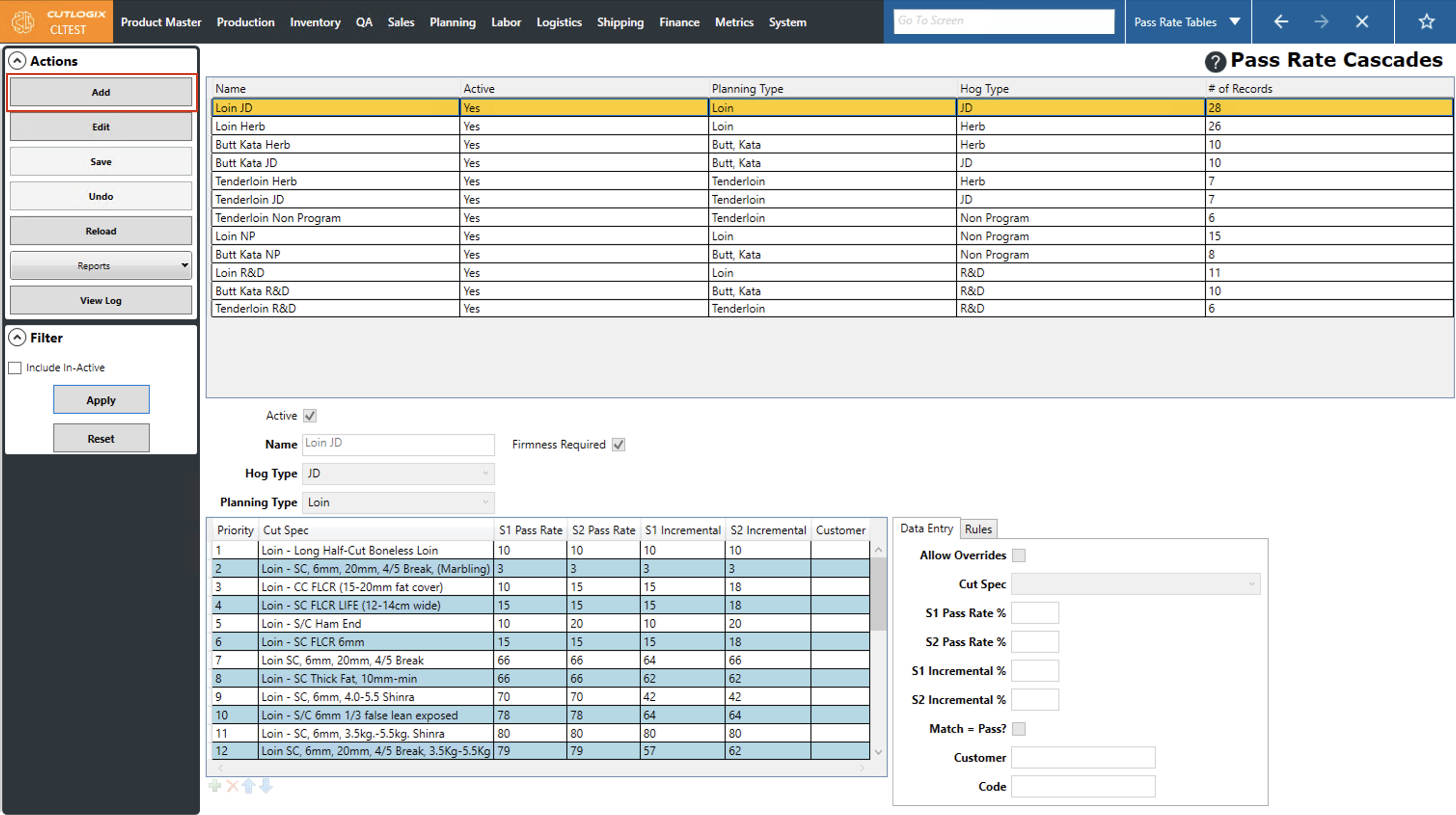 Step 3: This will enable editing at the bottom of the page for the pass rate cascade. You can edit the name and hog type for the pass rate cascade. For the records in the cascade you can click on them and use the blue up/down arrows at the bottom of the page to shift the priority of them up or down. Clicking "X" on a selected record will remove it and clicking "+" will let you add a new one to the pass rate cascade. On the right side of the page, details about the pass rate record can be edited in the "Data Entry" table and the rules that apply to the pass rate record can be modified in the "Rules" tab.