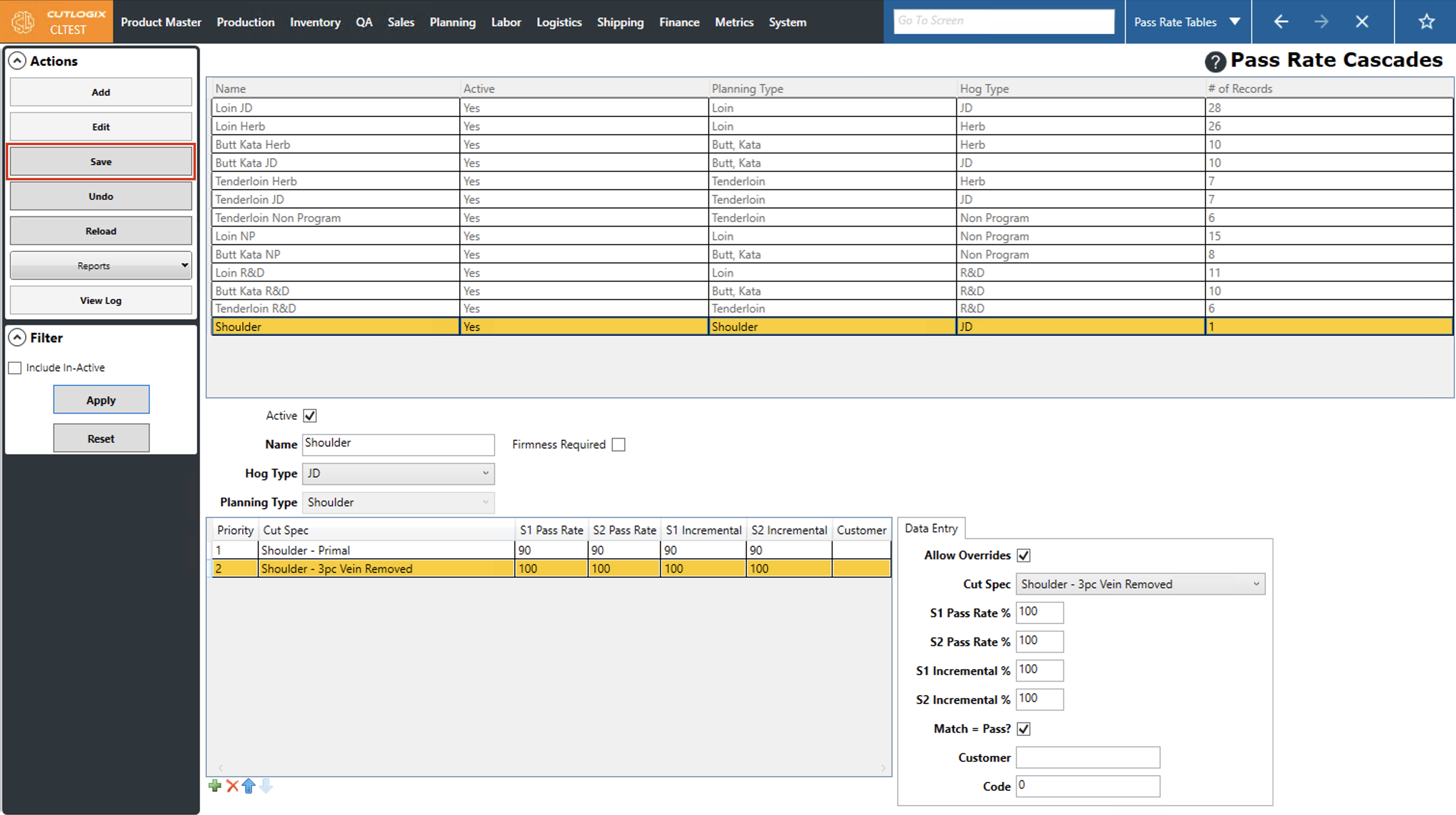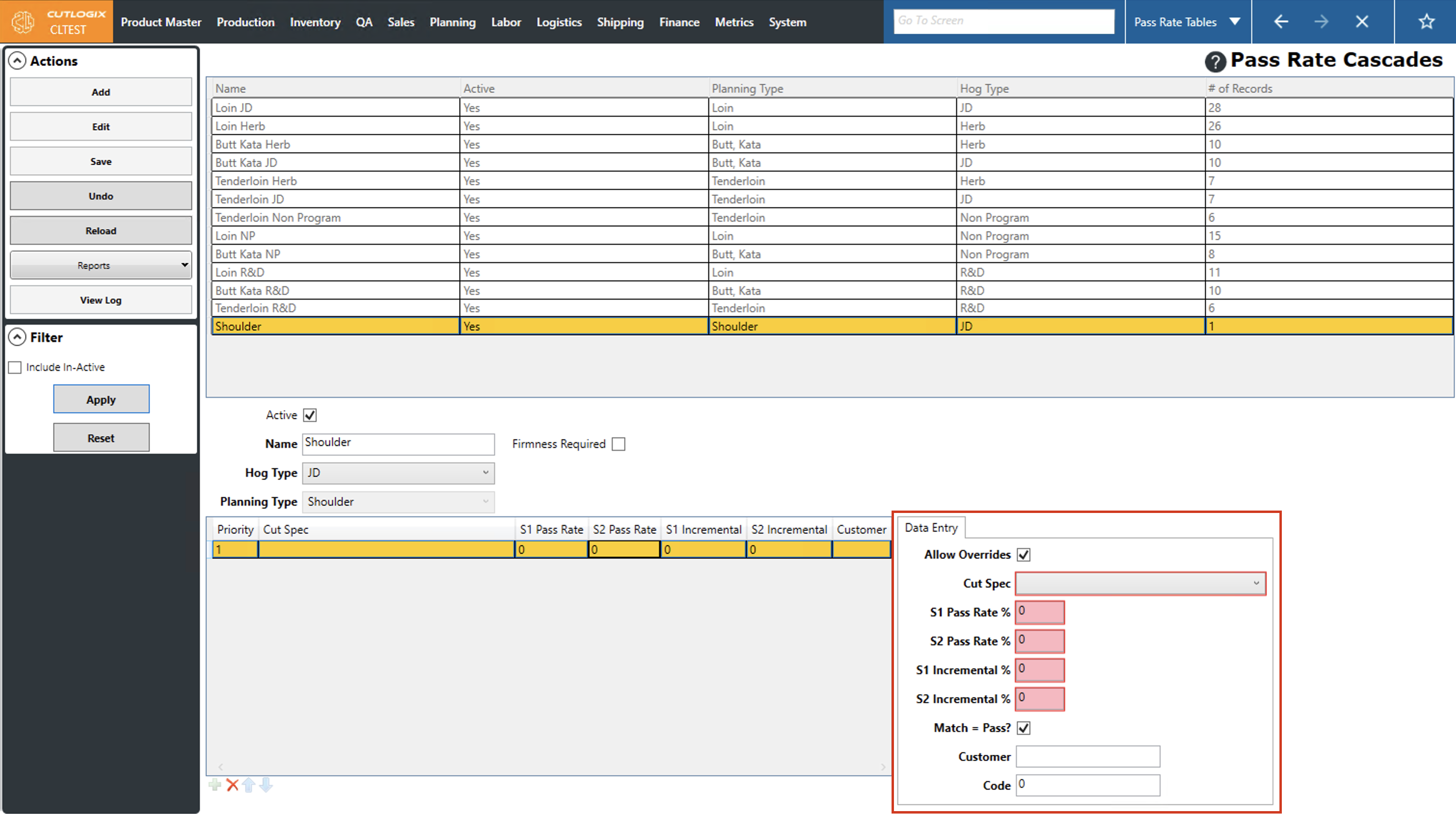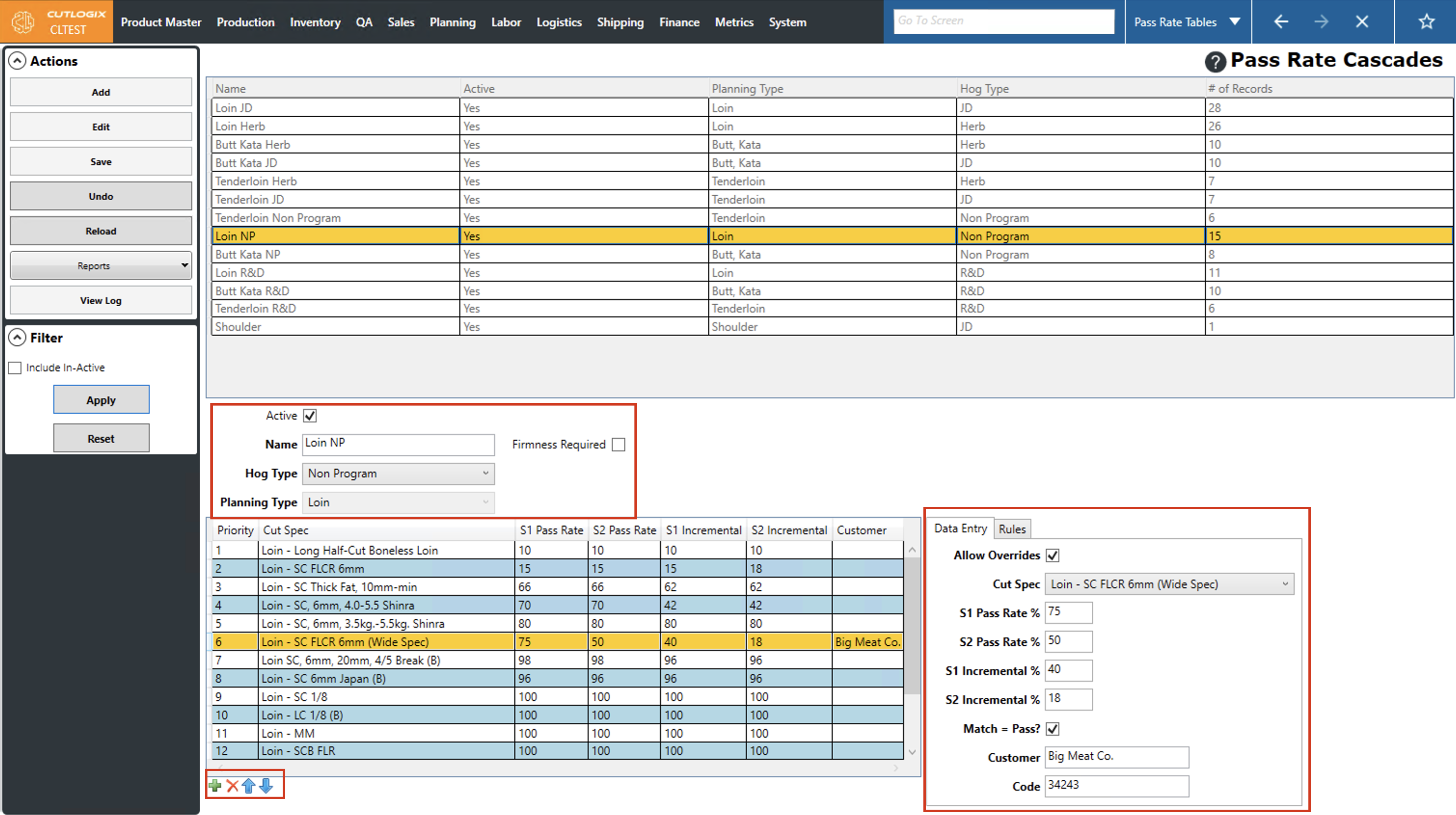 Demo A pass rate indicates how often a cut of meat meets the standards to be sold as a specific product. Typically, the lower the pass rate on a product, the higher the profit margin. This is why tables will often show products with a lower pass rate sitting at a higher position in the table (i.e. at a higher priority).