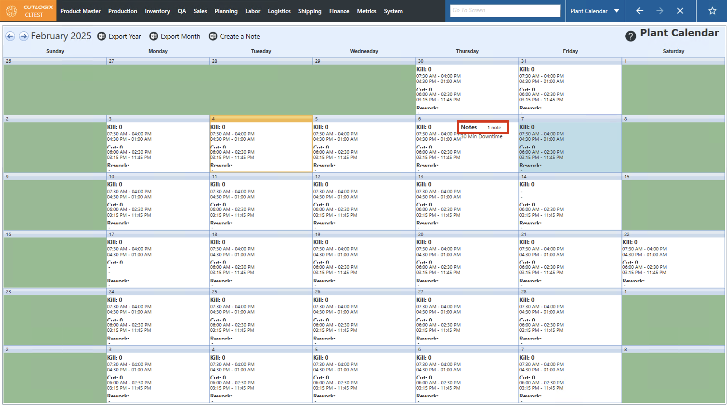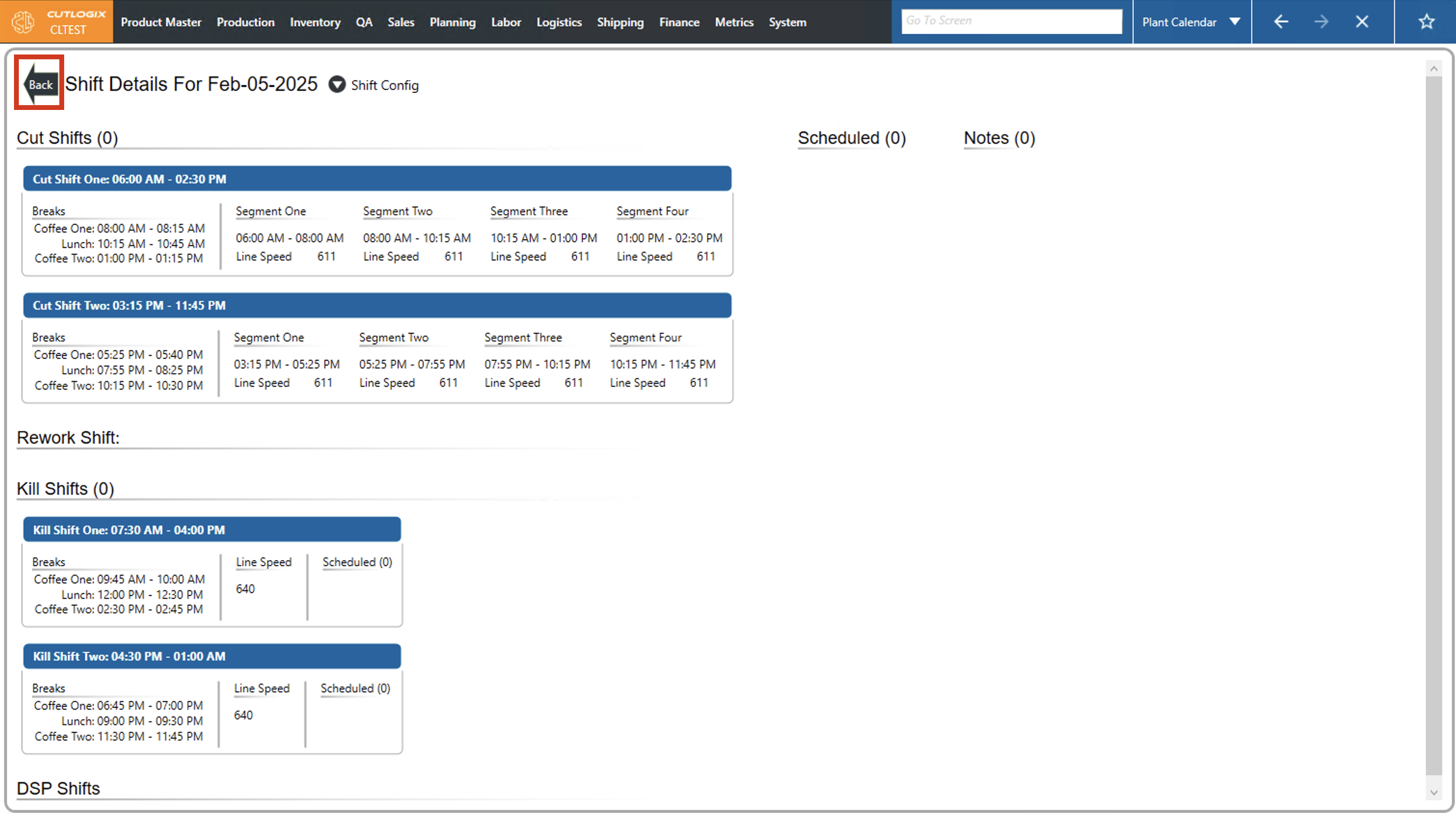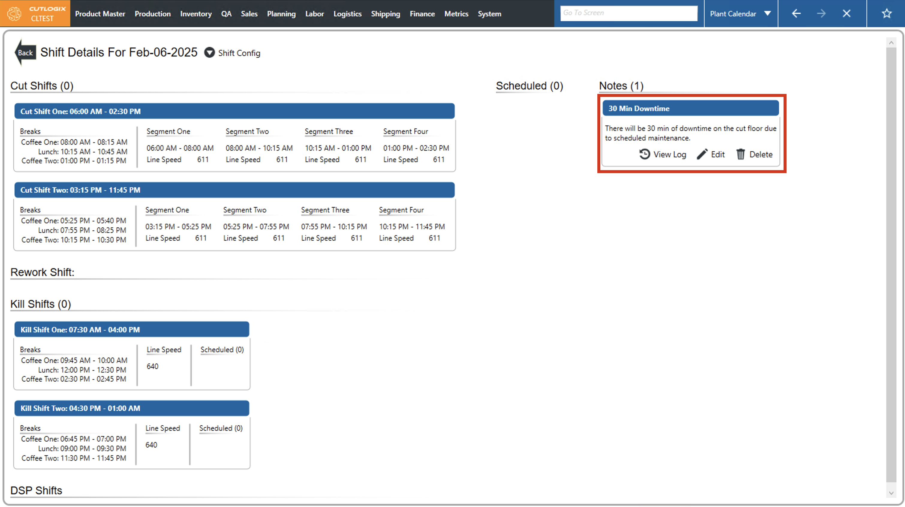 Step 3: This will open a details page with more information about the selected day. In here you can view more information about Kill and Cut Shifts, hogs scheduled for the day as well as notes (the previous section outlines how to add them).