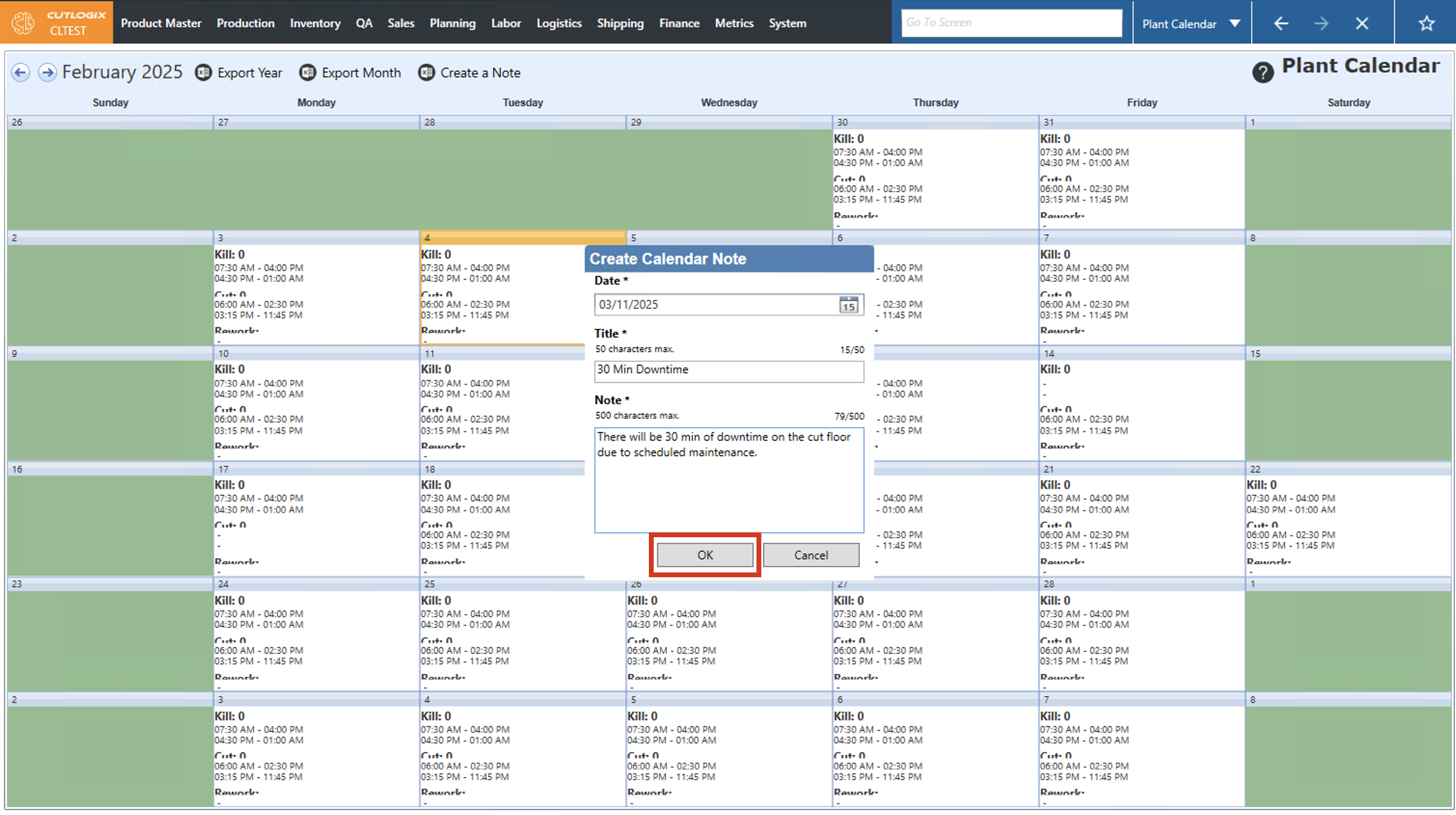 Step 4: Once you've filled out all the required information (highlighted in red on the dialog), click "OK" to save the note on the calendar. If you don't want to save the note, clicking "Cancel" will discard the note, and it will not be saved.