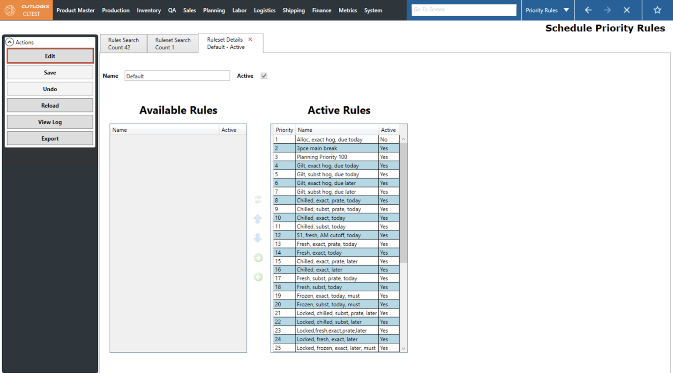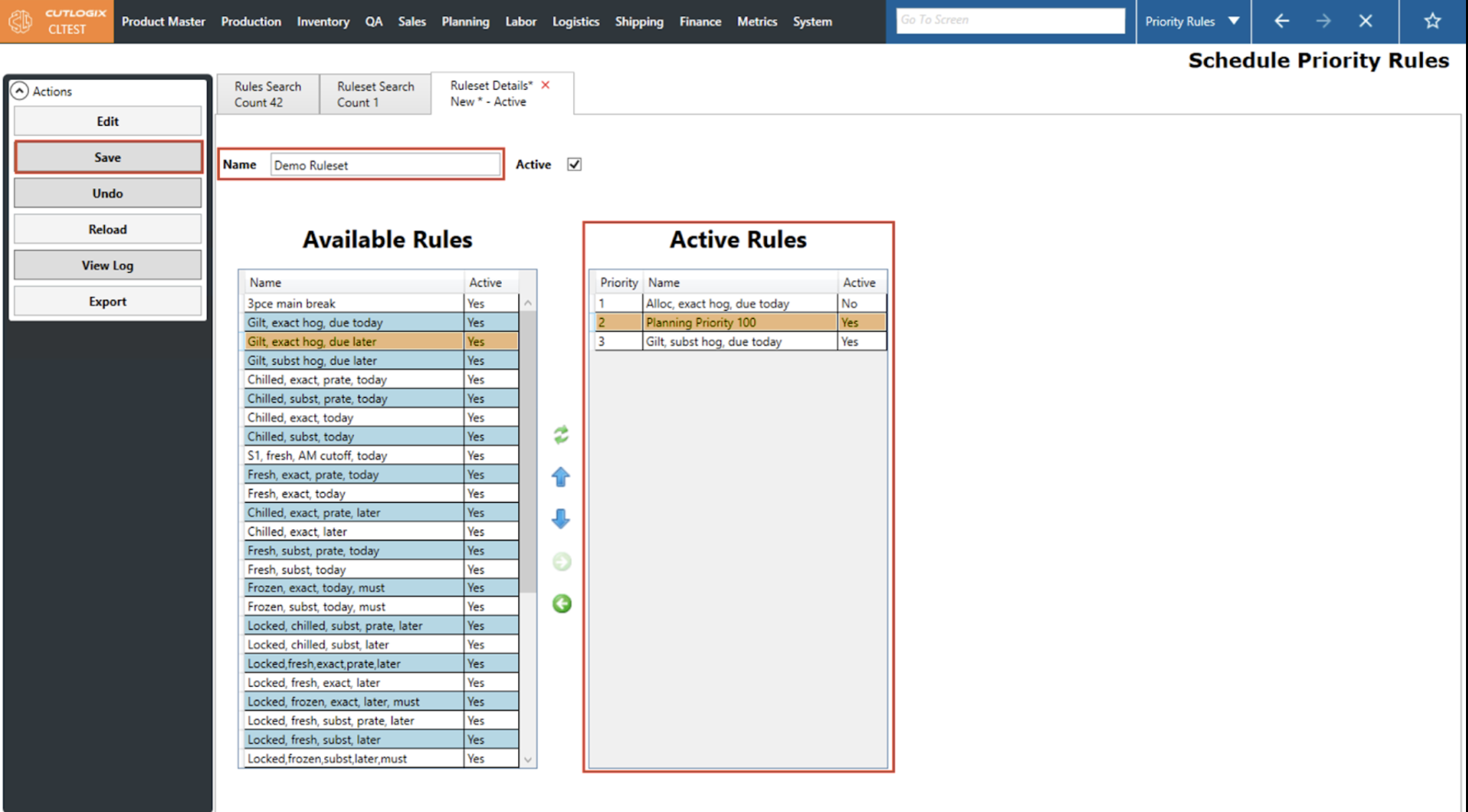 Step 4: Users can make their desired changes to the rules priority by moving them up or down with the blue arrows. They can also move rules in or out of the set by selecting them and using the green arrows. Shifting them into the Active Rules section makes them part of the rule set while shifting them out removes them from it. Lastly, users can edit the ruleset’s name and choose whether it is active. If it is active then when it is applied to schedules the planning system will use its rules. If it is inactive, the planning system will use the default hardcoded rules.