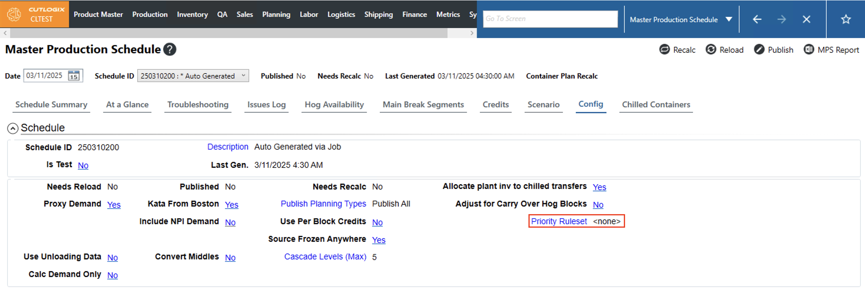 Once a ruleset has been created, users can assign it to a schedule in the MPS on the config tab. If the 'none' option is selected then the system will default to a set of hardcoded rules. Clicking the hyperlinked text will allow users to select a defined ruleset from the dropdown and click ok to apply it to the selected schedule.