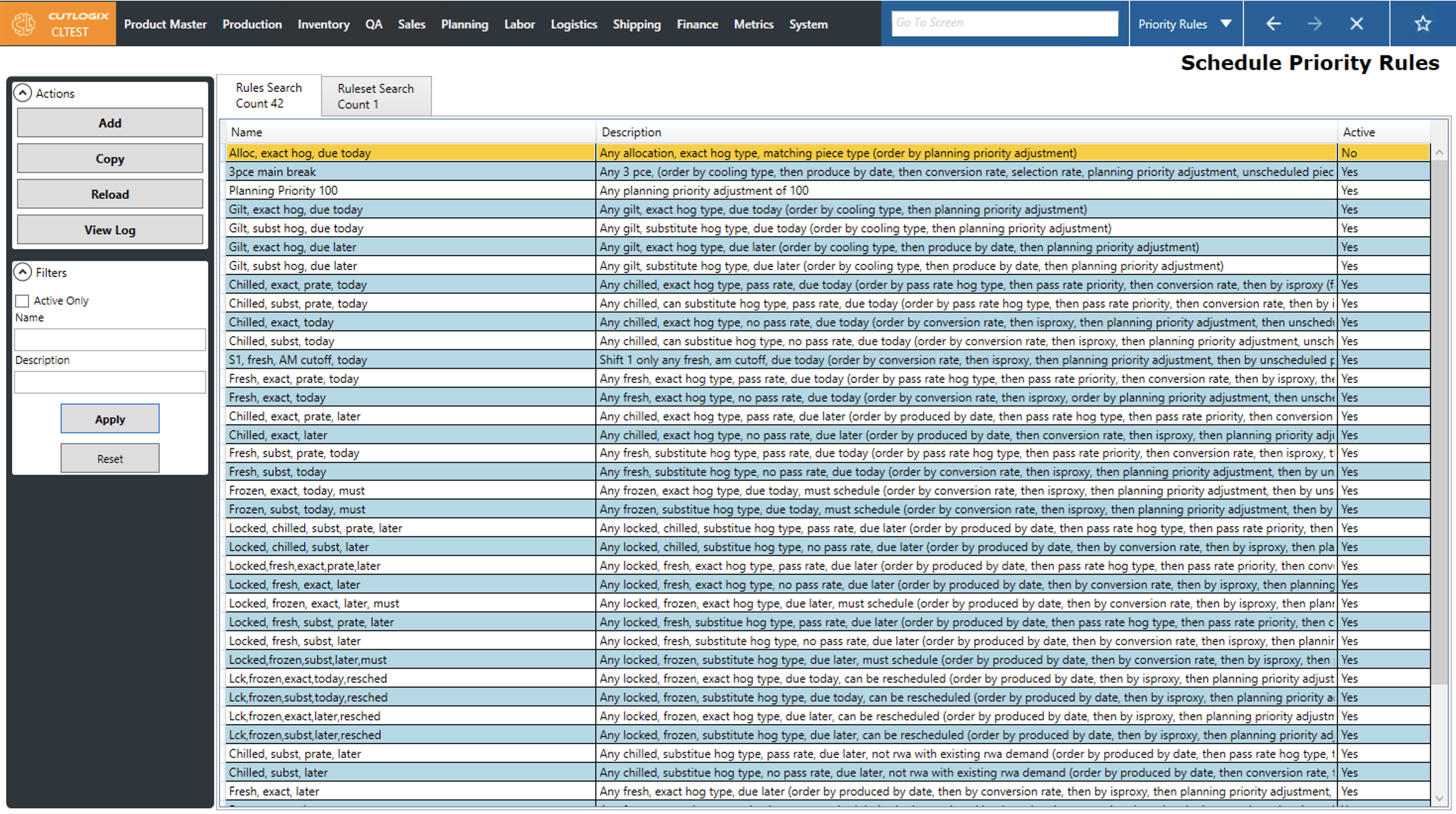 The priority rules screen provides users with a way to define rules and rulesets that will directly tell the planning system how it should make decisions when creating a production schedule. The typical workflow of this screen is that users will start on the Rules Search tab. This tab presents users with a data grid where each row is a rule. The name and description columns are both user defined fields that can be used to give a sense of what the rule does at a glance. The active column indicates whether the rule will be ignored or applied by the planning system.