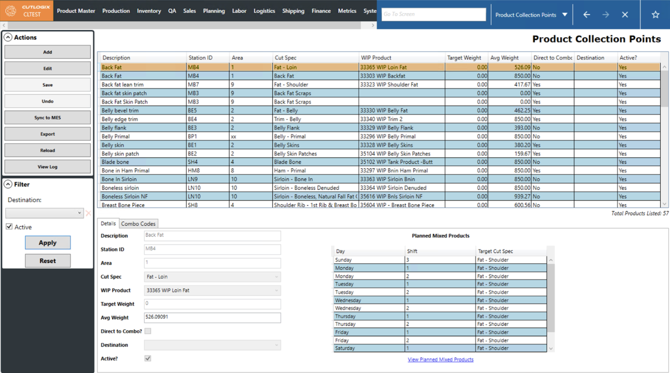 The product collection points screen allows users to enter the plant’s collection at which credits or work in progress (WIP) products are accumulated before being moved to an offline processing area. The main data grid at the top of the screen presents users with a list where each row is a collection point/station. The fields on the left of details tab on the bottom of the screen presents the same information as the data grid and is used for data entry when adding or editing. The Planned Mixed Products data grid to the right pulls any planned mixed products defined for the chosen cut specification from the Planned Mixed Products screen. More information on this screen is available above.