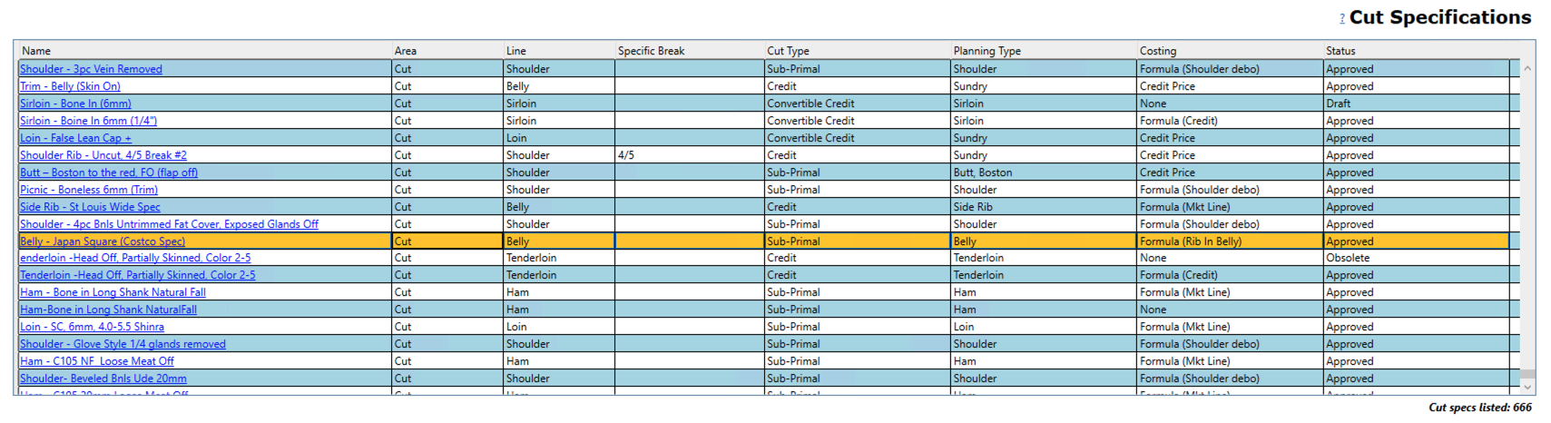 Demo Step 1: On the Cut Specification screen, in the grid, click on the link in the name (e.g. Loin ⅛)