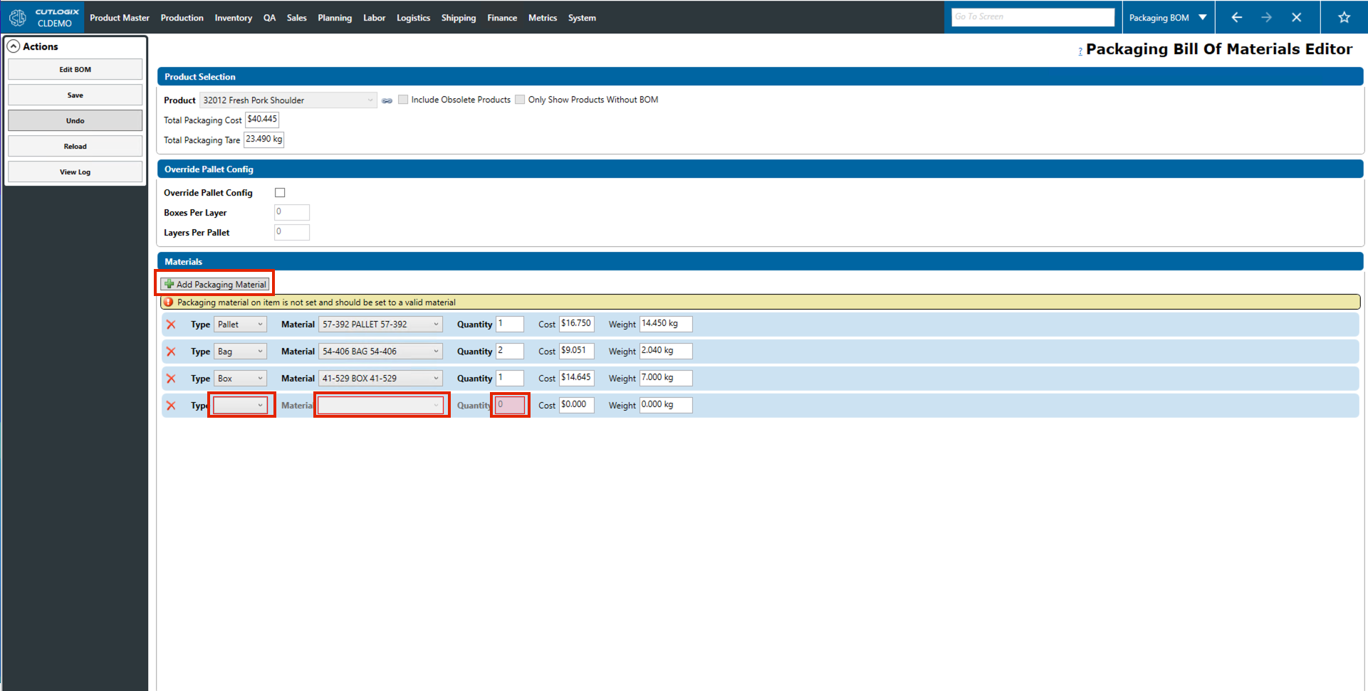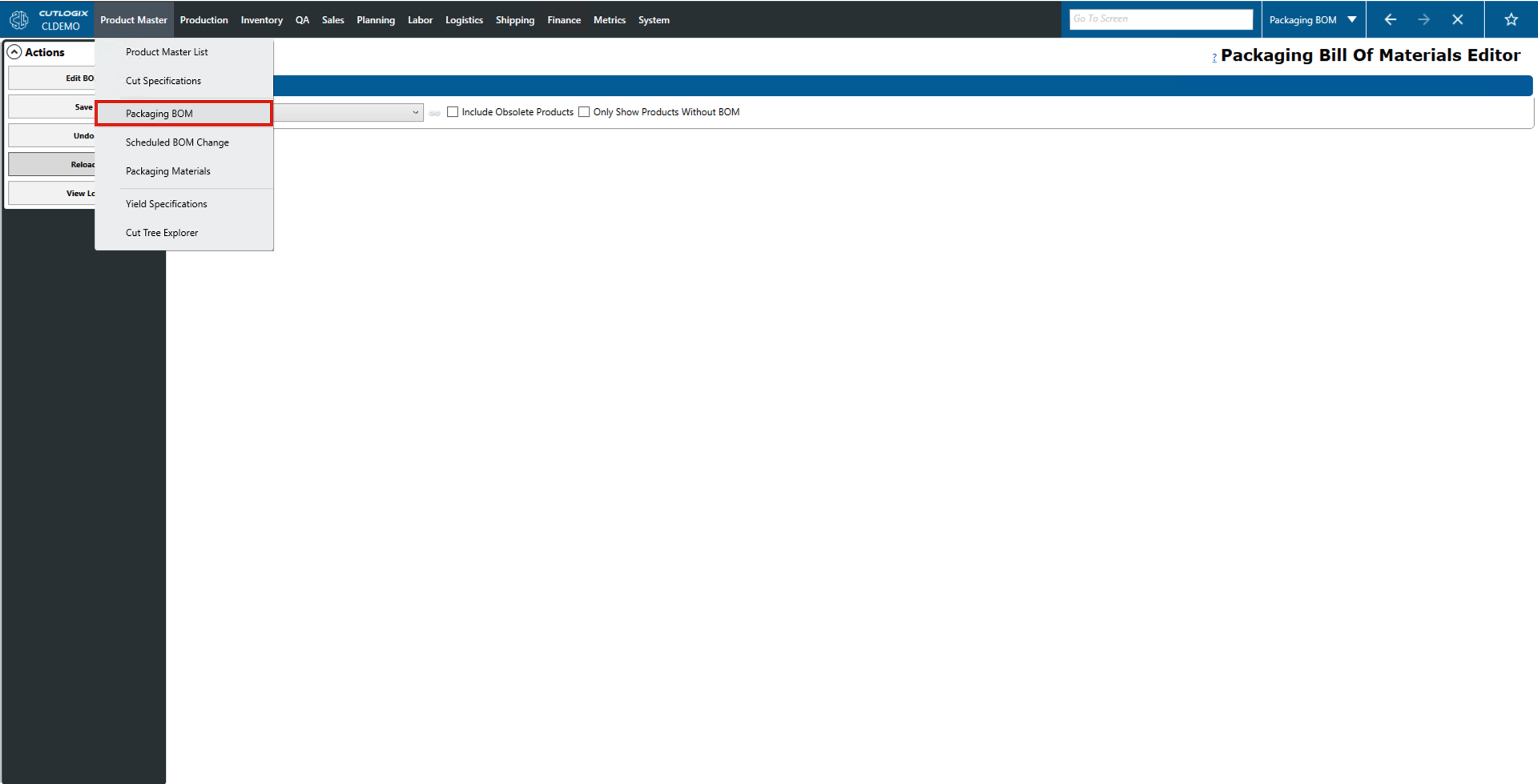Demo Note: There is no option to "Add" a Packaging BOM from this page in the actions panel. This is because a packaging bom is like an attribute of a product. The product is required to be selected first, then "Editing" the bom for the selected product allows you to add or remove materials to its packaging bom.