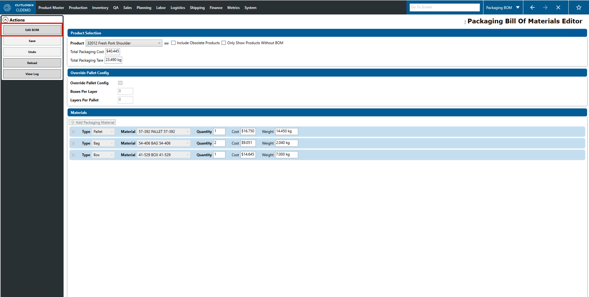 Step 4: The BOM details will be shown for the product. Here you can add a new packaging material to the BOM and edit the fields of existing materials on the BOM such as the type, material, quantity or cost. You can also override pallet configuration by clicking on the "Override Pallet Config" checkbox, then changing the box per layer and layers per pallet configuration.
