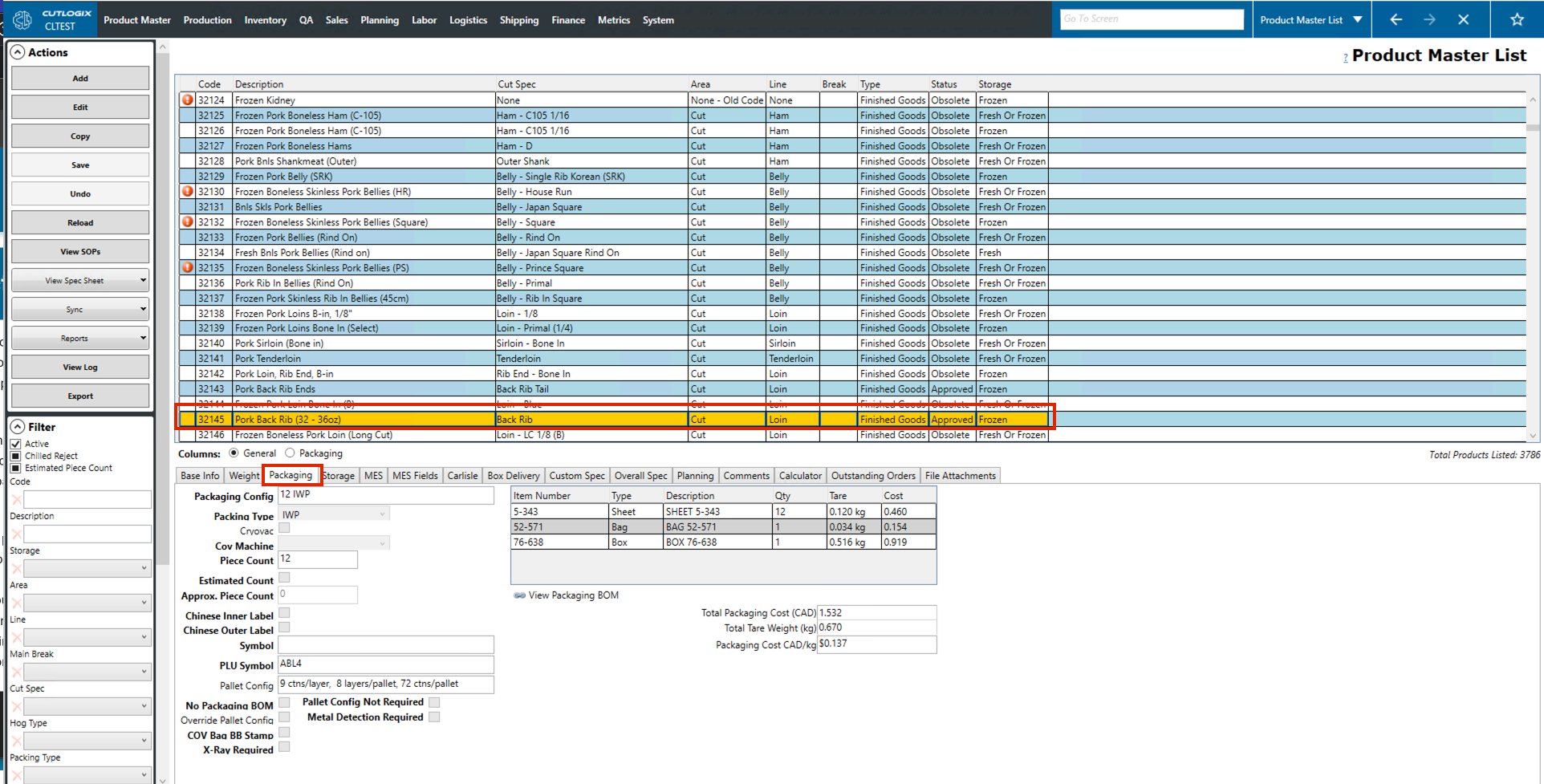 Step 3: You will be redirected to the product master list where the product you had selected on the packaging bill of materials page is pre-selected and the packaging tab is open for it. You can also navigate to other tabs for the product to view other information on it.