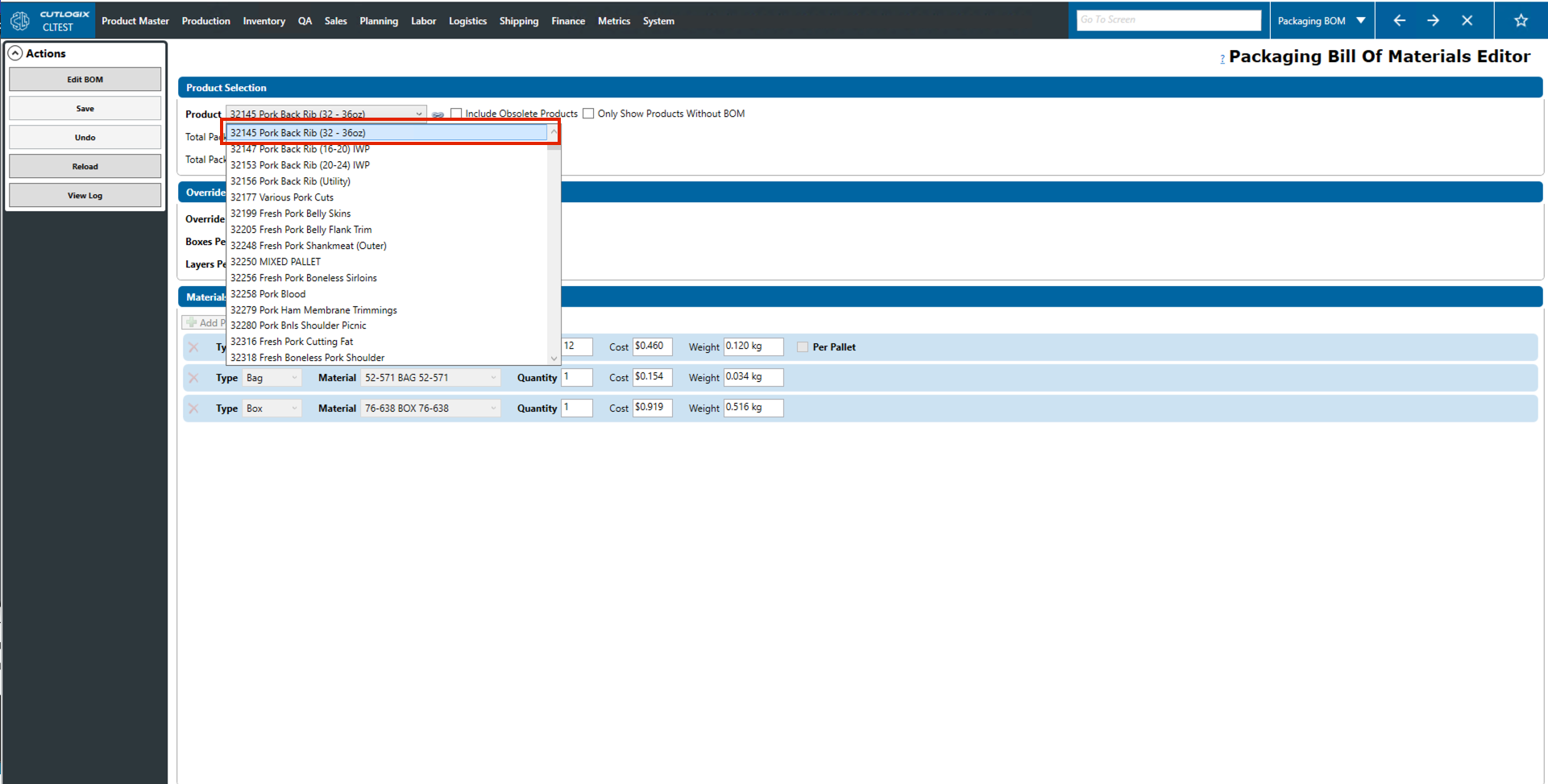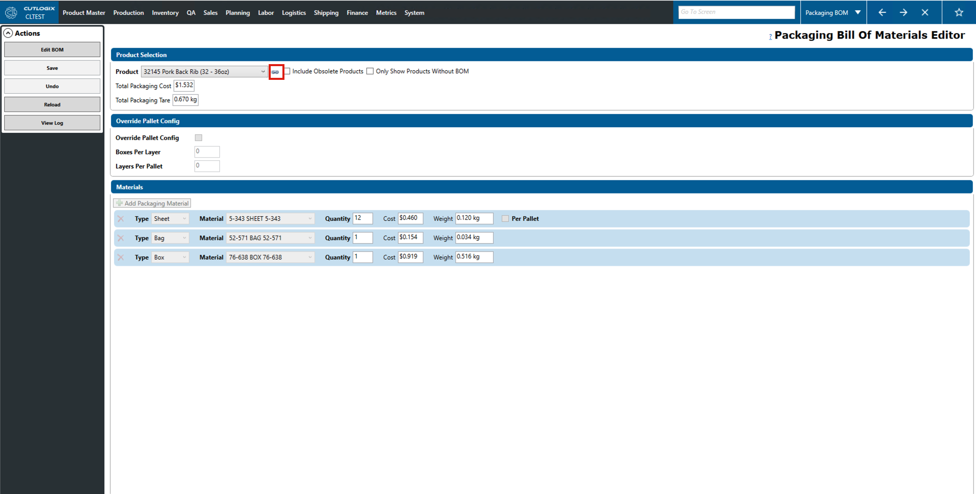 Step 1: Select a product from the "Product" dropdown menu on the "Packaging Bill Of Materials Editor" page. Once selected, the BOM for that product will appear.