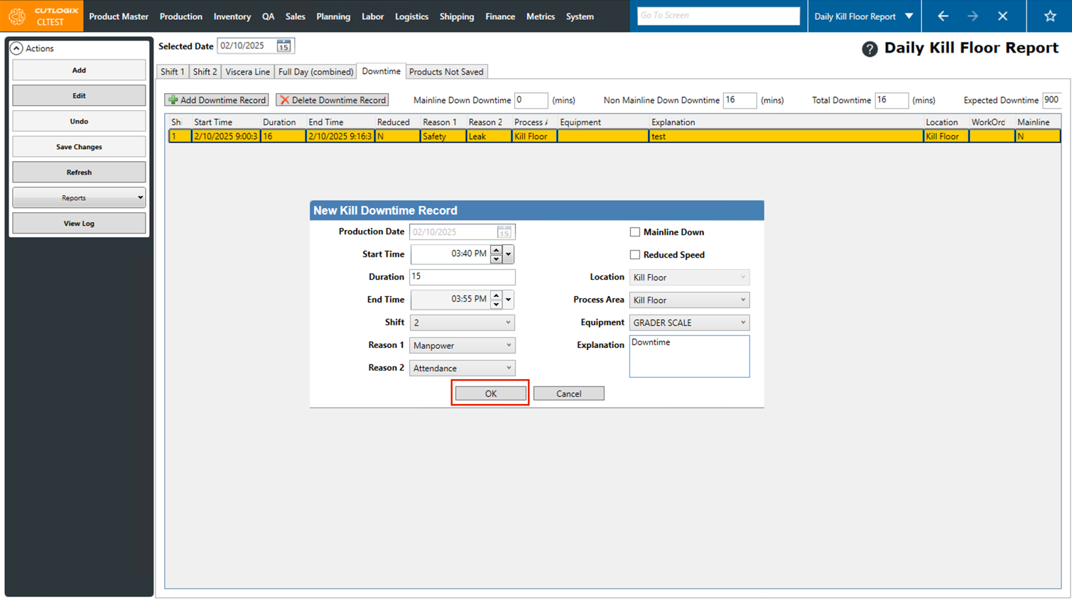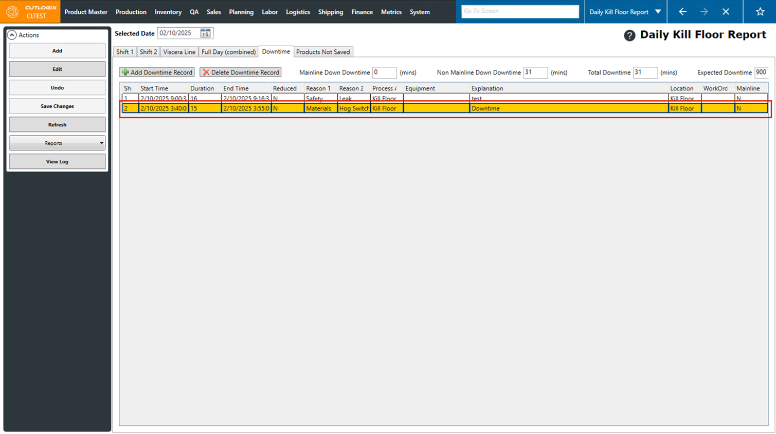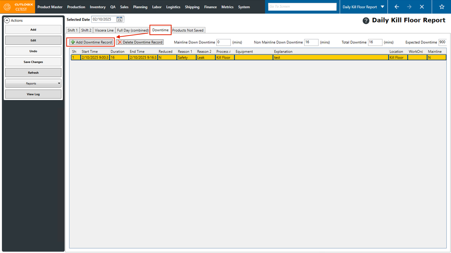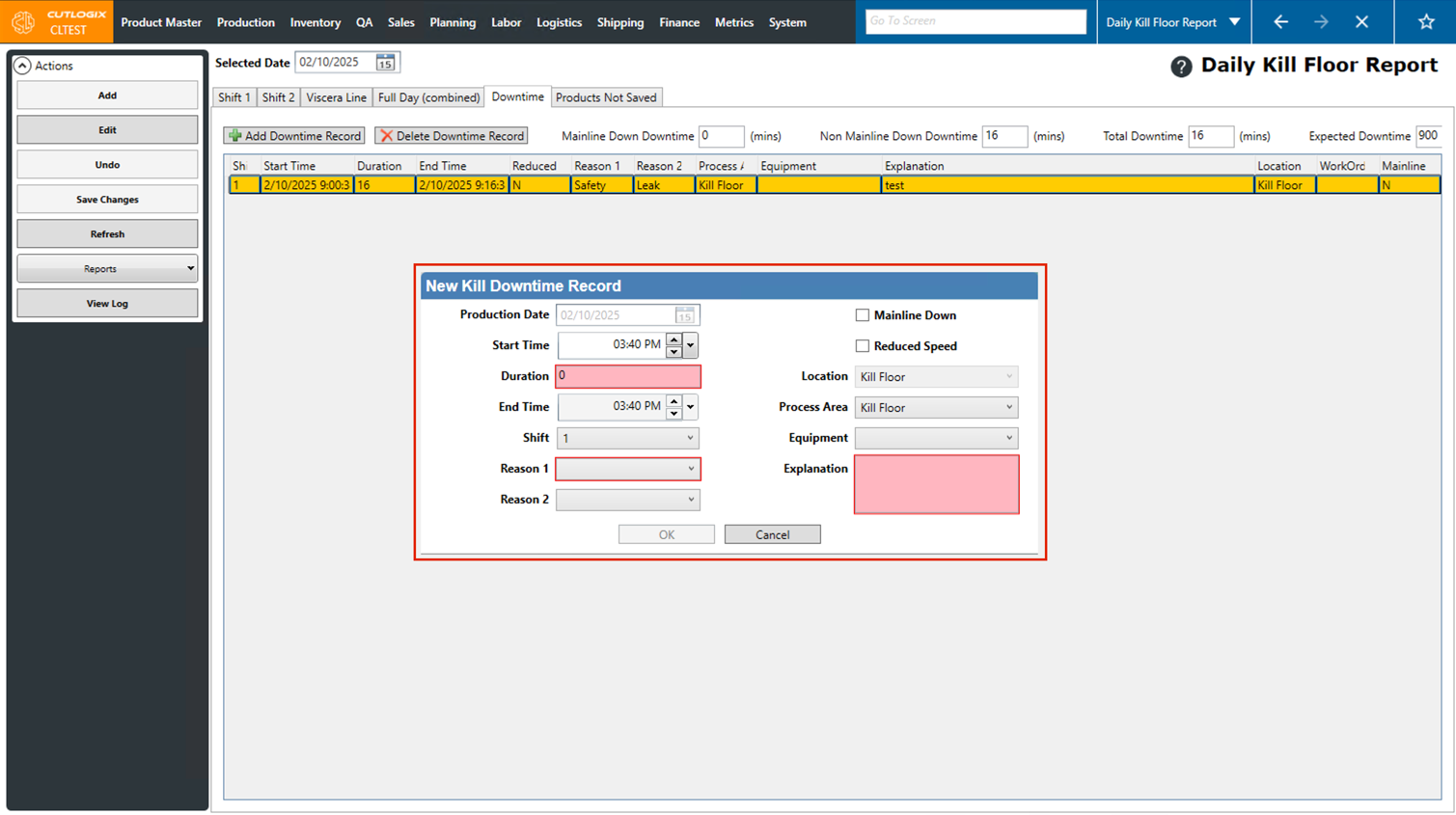 DemoStep 1: Open the "Daily Kill Report" page (Under the Production menu → Kill Floor → Daily Kill Report) for the date that you want to add a downtime record for.