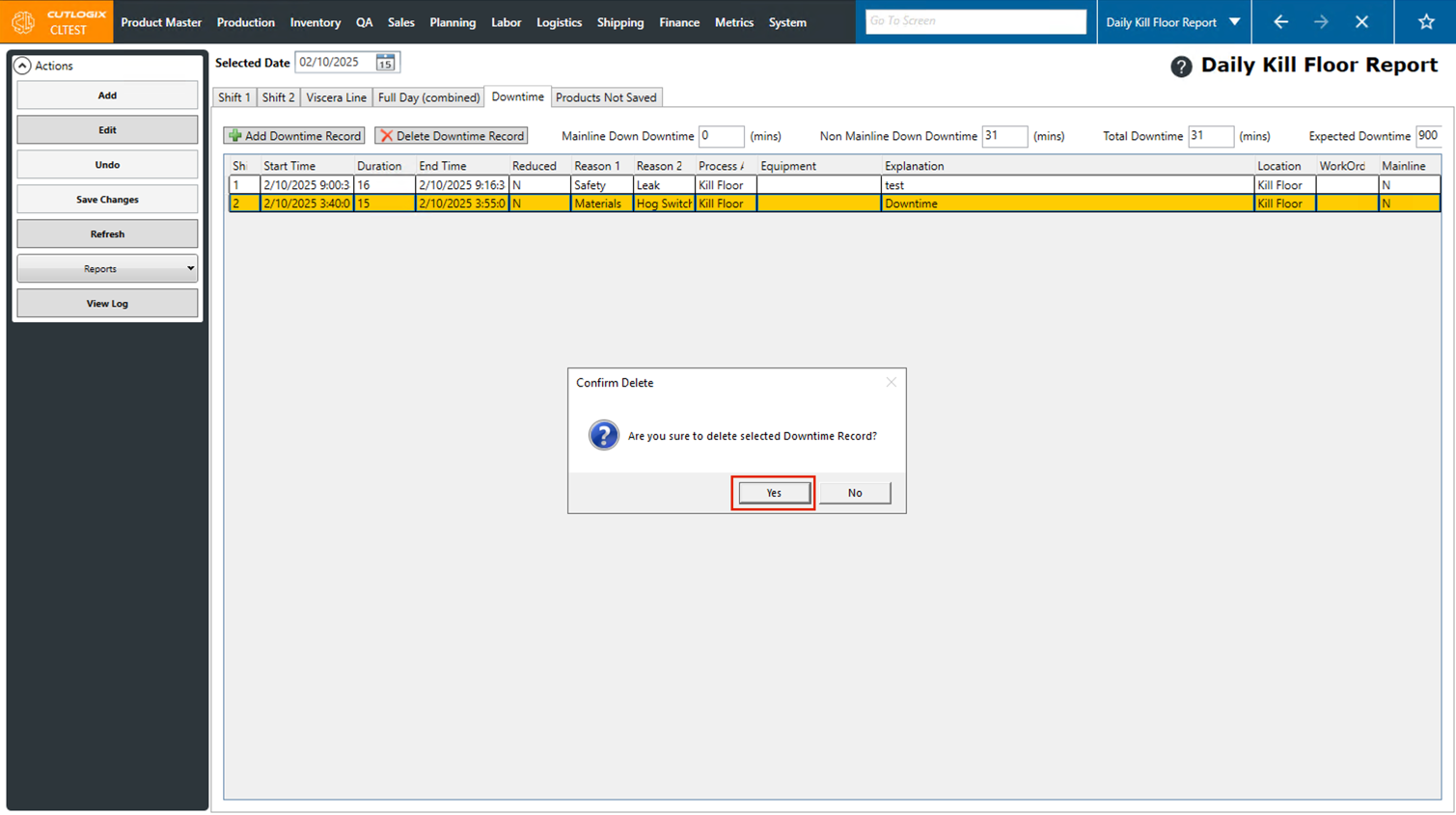 DemoStep 1: Downtime records can be deleted from the same area that they are created. Open the "Daily Kill Report" page (Under the Production menu → Kill Floor → Daily Kill Report) and choose the date that the downtime record you want to delete is on, then click on the "Downtime" tab.