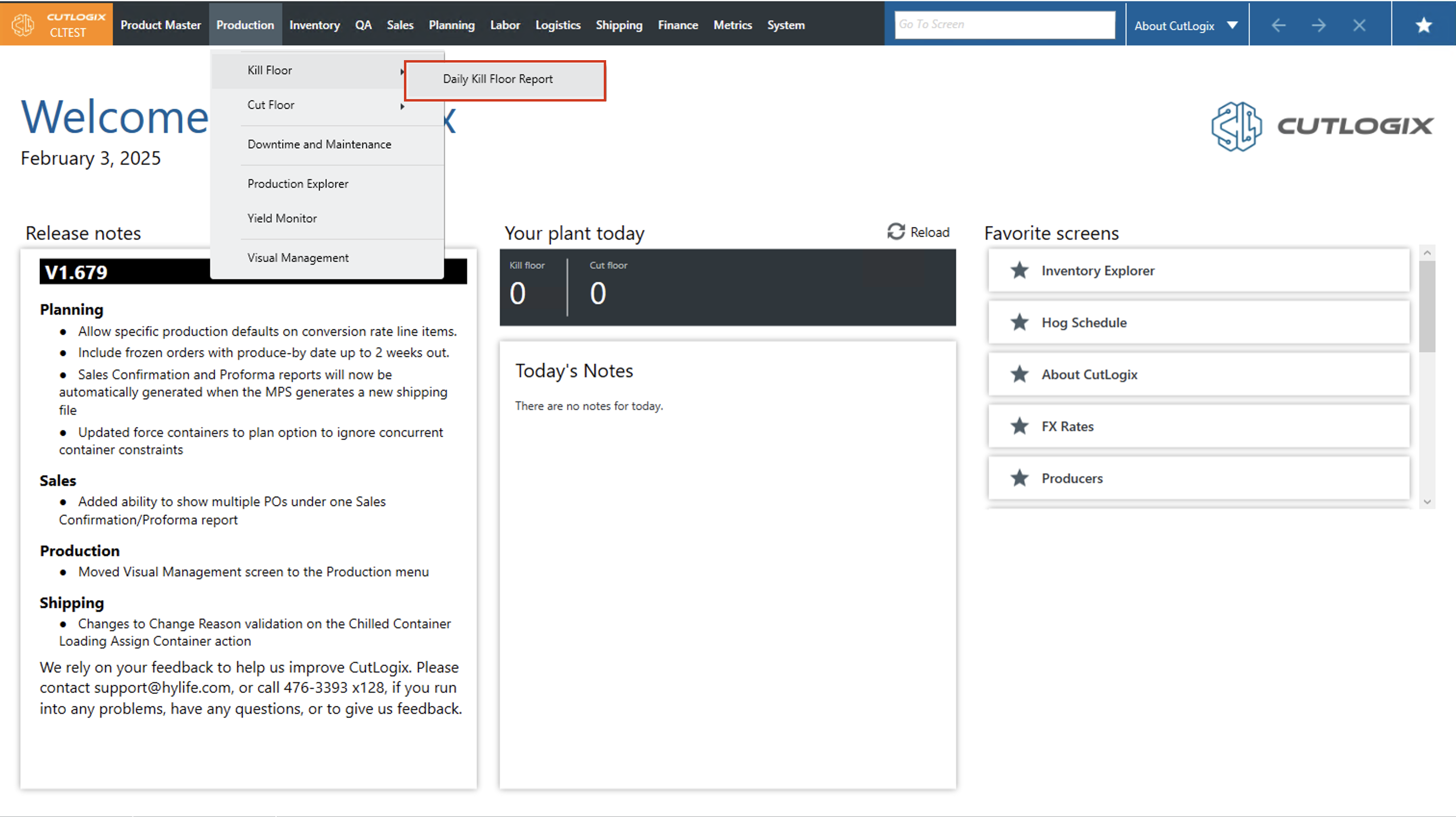 DemoStep 1: Navigate to the "Daily Kill Report" page (Under the Production menu → Kill Floor → Daily Kill Report)
