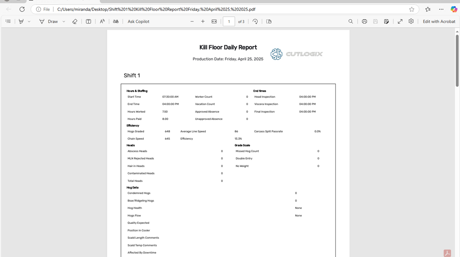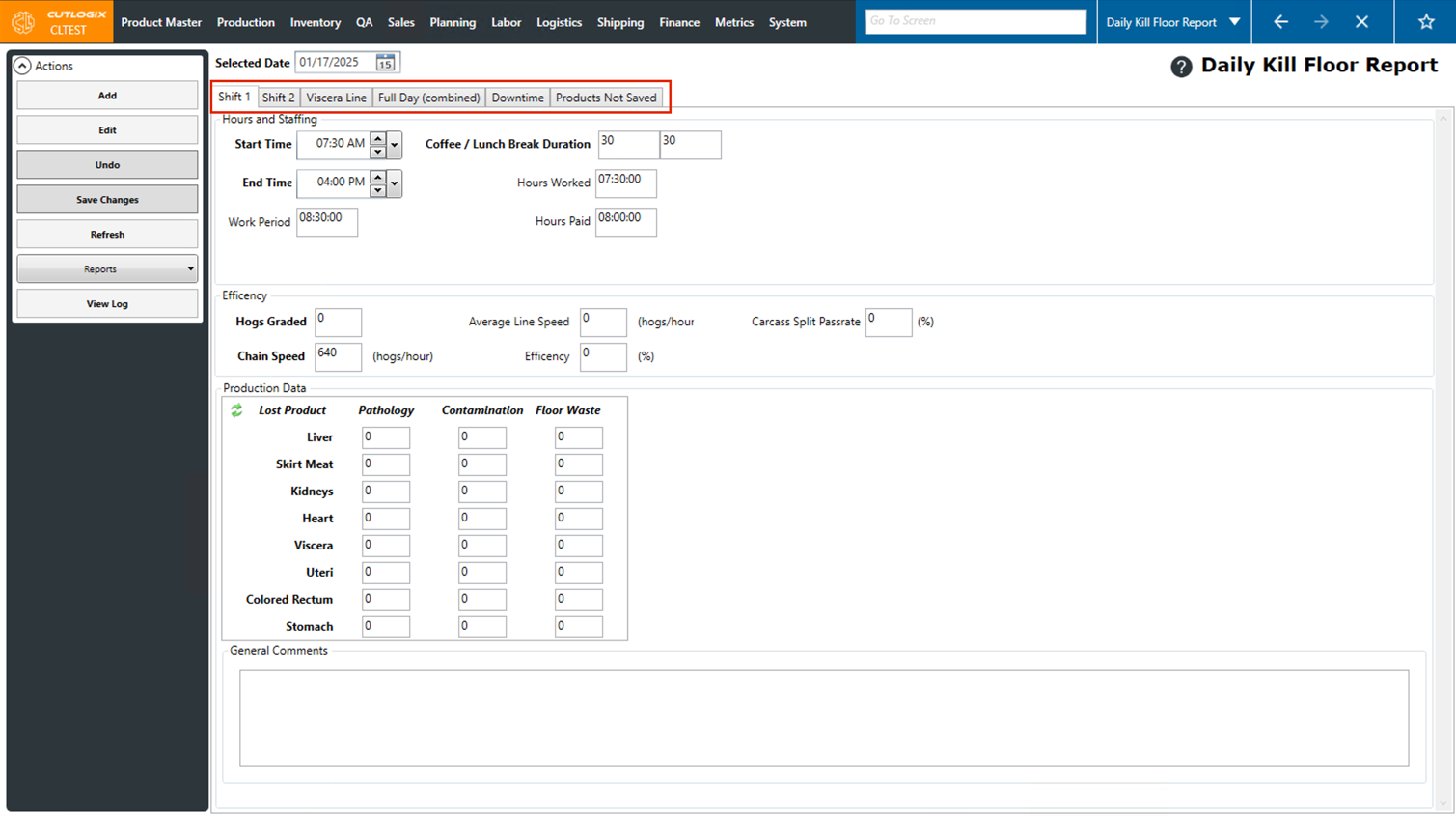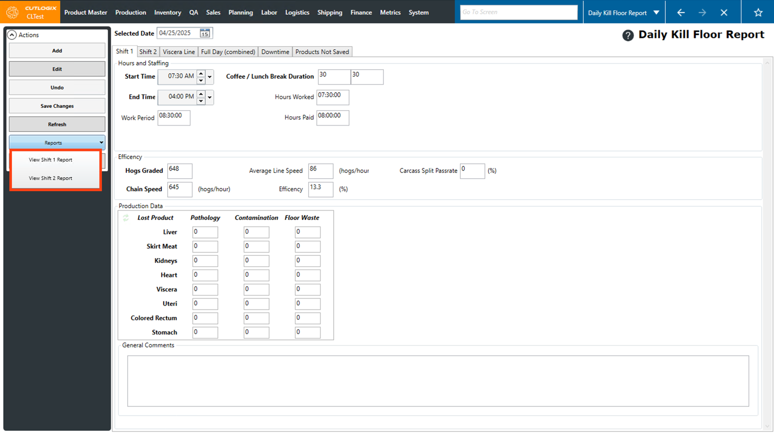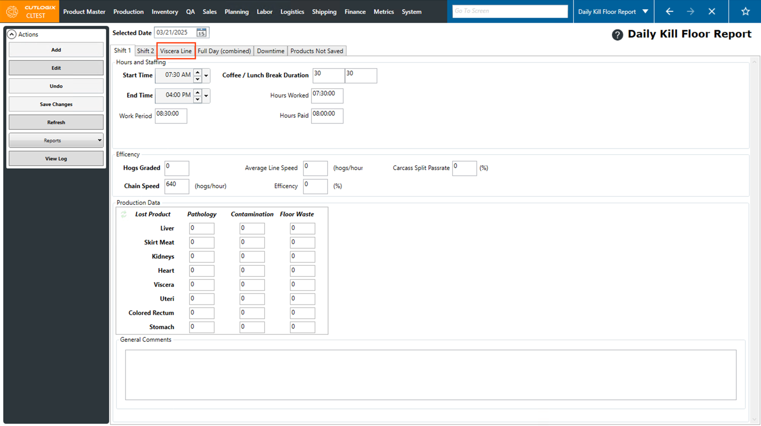 Step 4: When editing the report will be populated with that day's data. You can make changes to data in the Shift 1, Shift 2, Viscera Line, Downtime and Products Not Saved tabs.