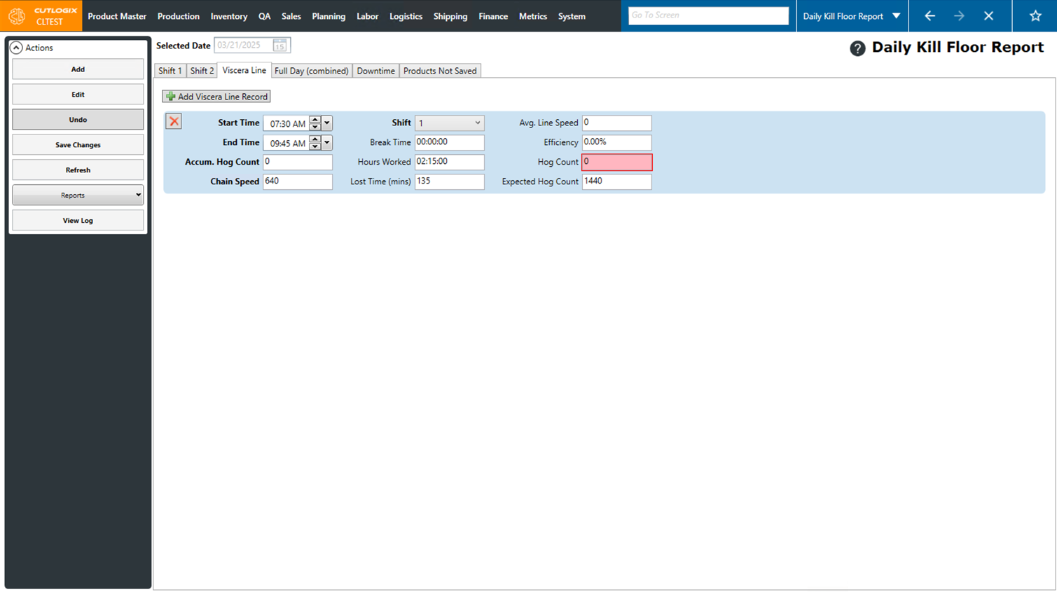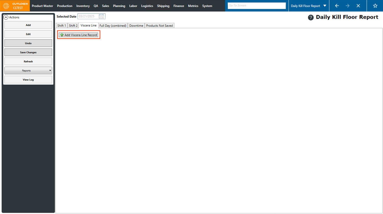 NOTE: In order to add a viscera line record, the chosen day must have a daily kill floor report added to it already.