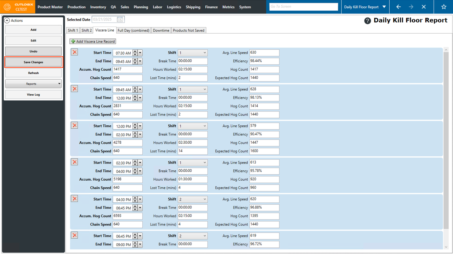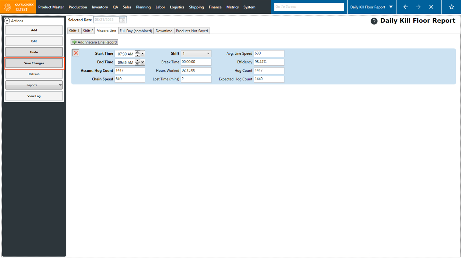 Step 5: Once you're finished making edits, click the "Save Changes" button in the Actions panel to save the changes with the Daily Kill Floor Report. If you don't want to save your edits to the report, clicking "Undo" in the left actions panel will discard any changes.